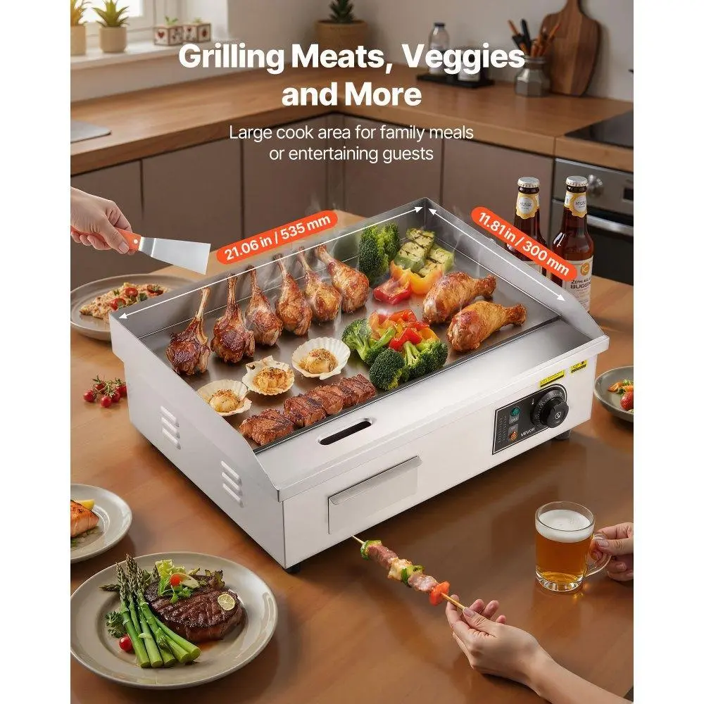 5. VEVOR Commercial Electric Griddle, 21 x 11.8 inch, 1750W, 122-570°F Adjustable Temp Control, Stainless Steel Countertop Flat Top Grill with 2 Spatulas, 2 Brushes and 4 Foot Pads, for Steak, Pancake