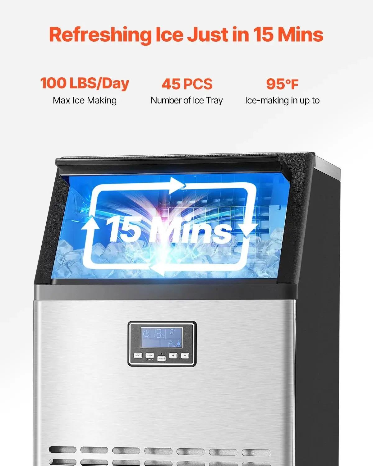 The VEVOR Commercial Ice Maker Machine is a powerful ice production solution. It can produce up to 100lbs of ice in just 24 hours, with a storage capacity of 33lbs. This machine efficiently produces 45 ice cubes in just 15 minutes. Perfect for bars, offices, and restaurants, it's a freestanding unit designed for self-cleaning.