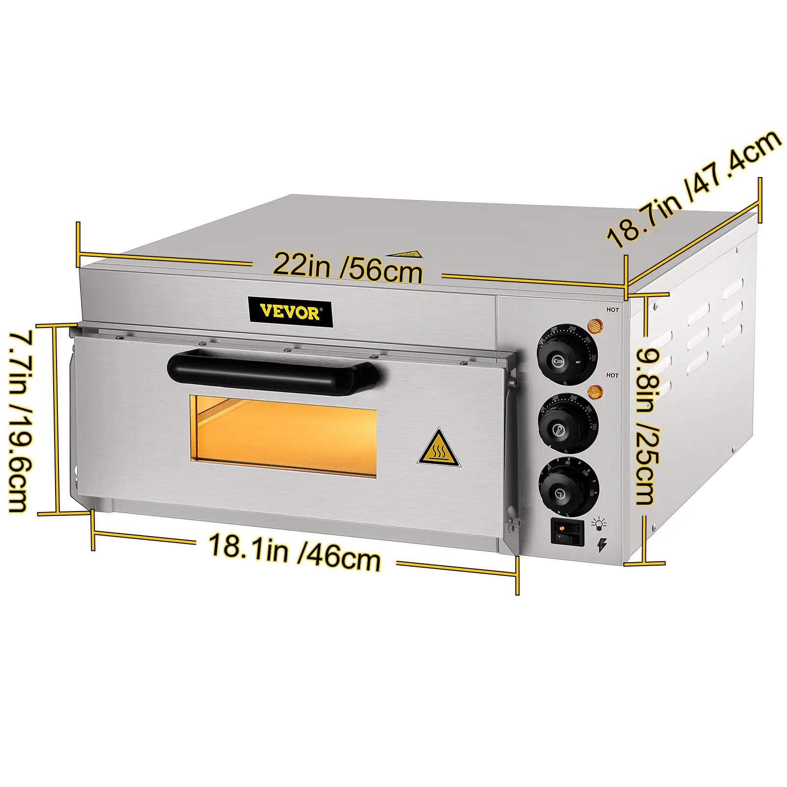 • Humanized Details: We provide you with a single-layer electric pizza oven with interior lighting and a viewing window. The explosion-proof glass is adopted to quickly check the cooking status. Plus, other considerate design details are also integrated, such as dense emission holes for fast heat dissipation; an insulated plastic handle for secure operation; and 4 non-slip feet to keep the machine stable.