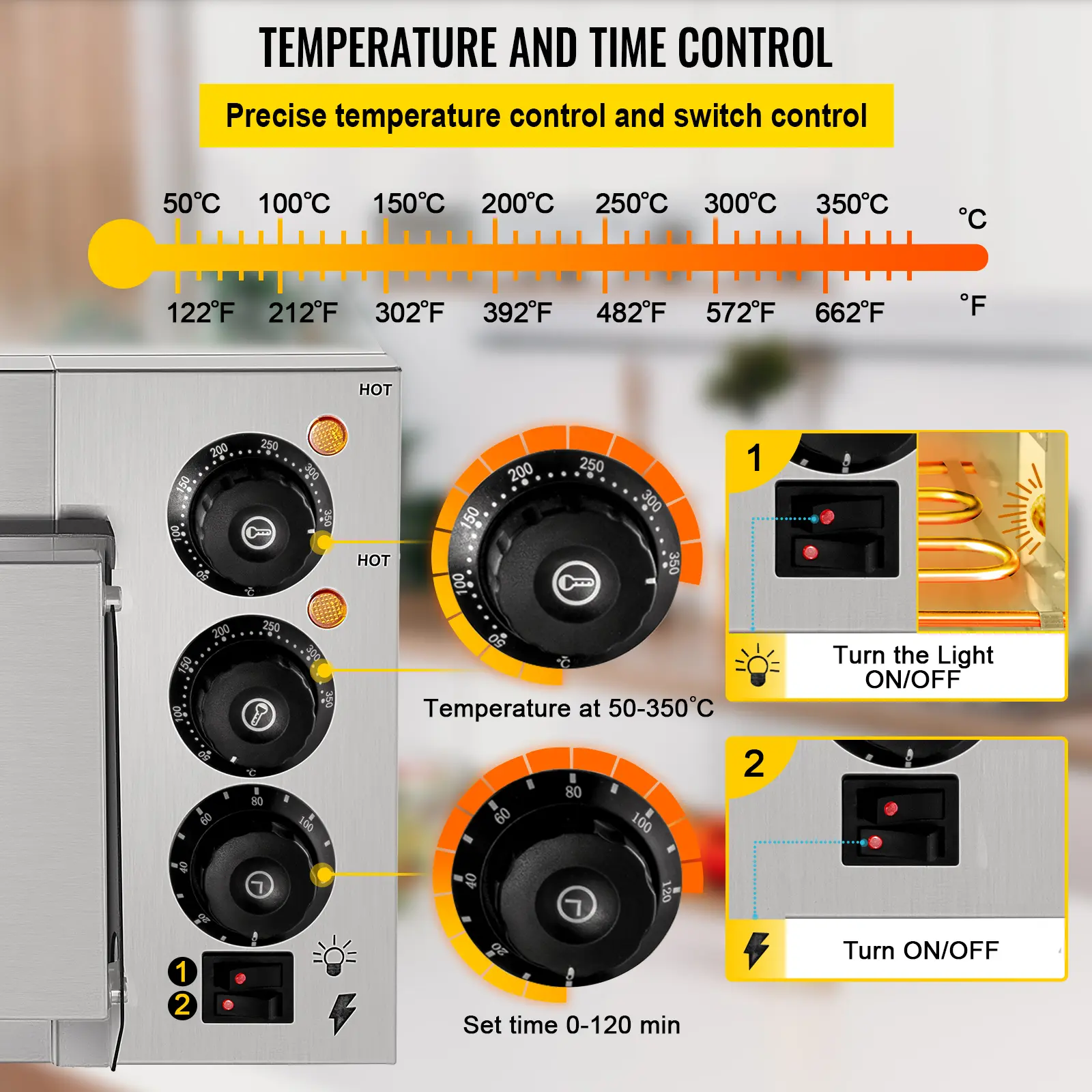 • Precise Control: Our electric pizza oven is equipped with 2 thermostat dials to individually control the top and bottom temp. 122-662℃ adjustable temperature meets your needs for cooking different ingredients. The time setting knob of this pizza cone machine allows up to 60 minutes for satisfying different cooking tasks.