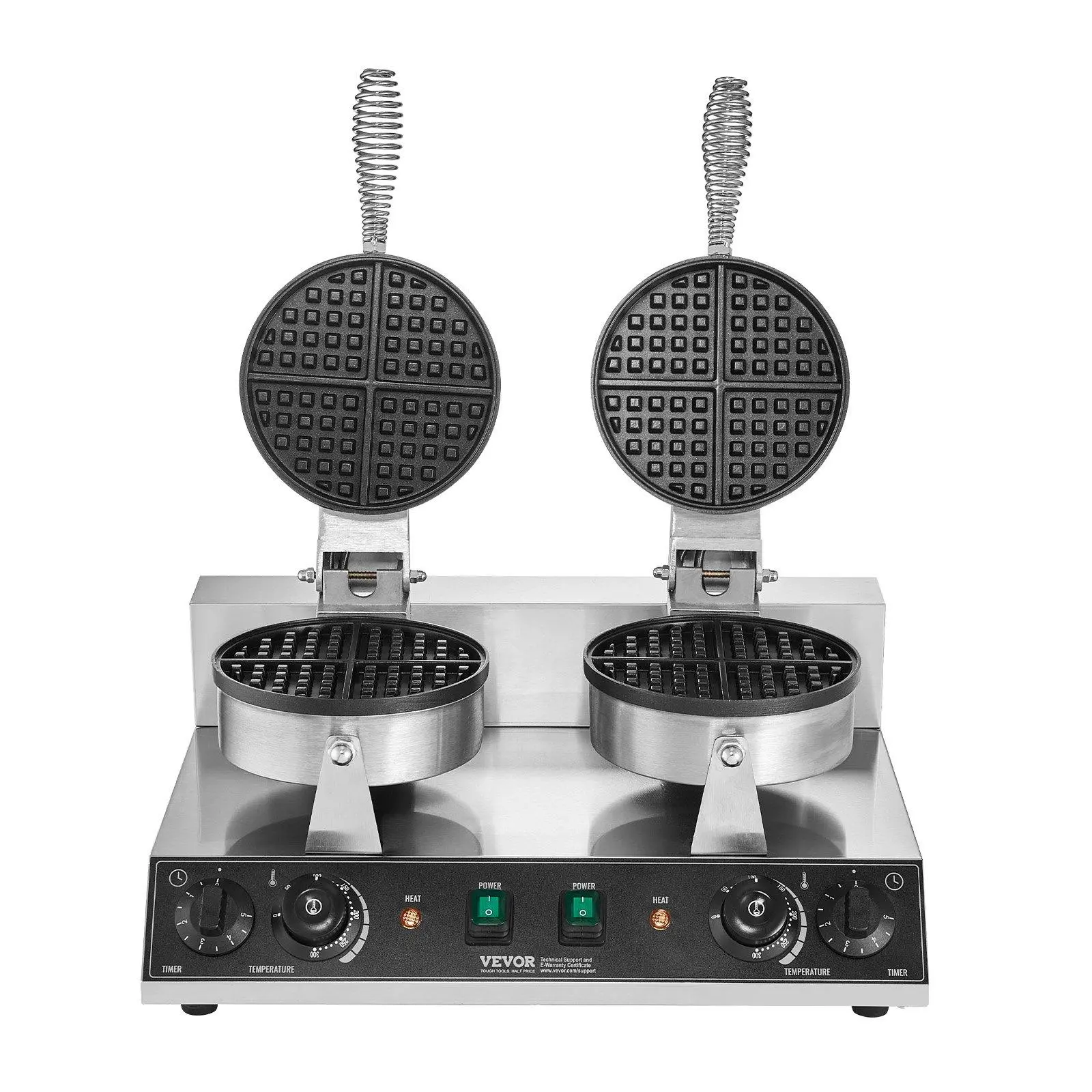 ·Dual Temperature Control Design: The dual-sided waffle iron features independent control panels, allowing simultaneous cooking of two waffles. The temperature control knob (122-572°F / 50-300°C) lets you adjust according to your preferences. Customize it to create personalized waffles, whether you prefer them crispy or fluffy. With individual preparation and audible alerts, it's easy to operate—it reminds you to add batter and indicates when the waffles are cooked, so you don't have to watch it constantly.
