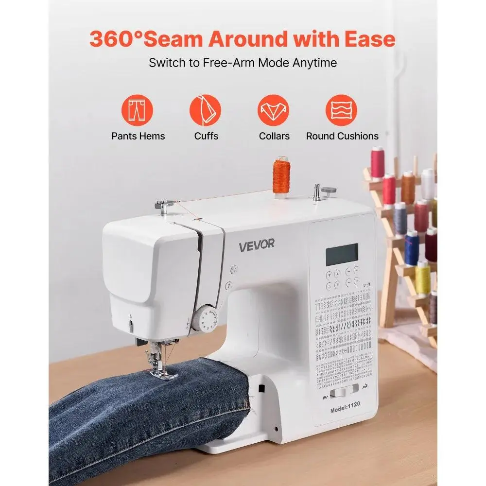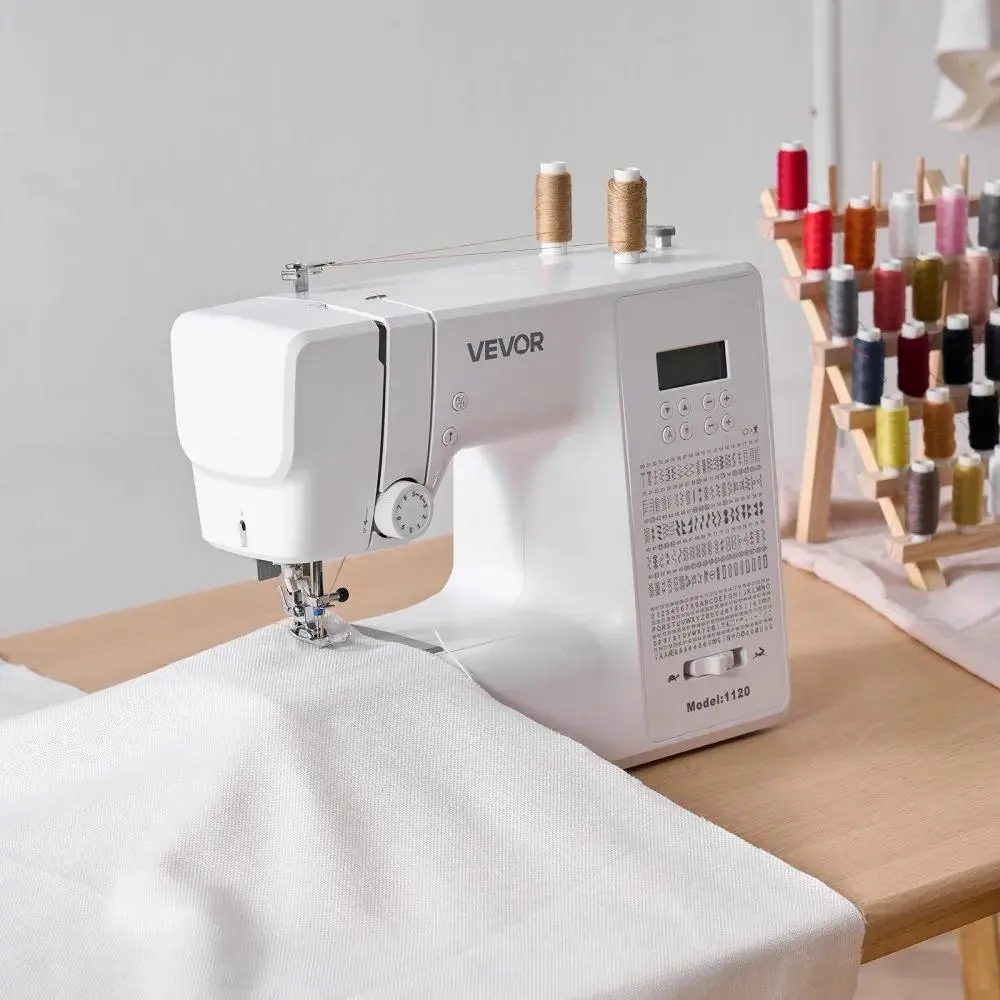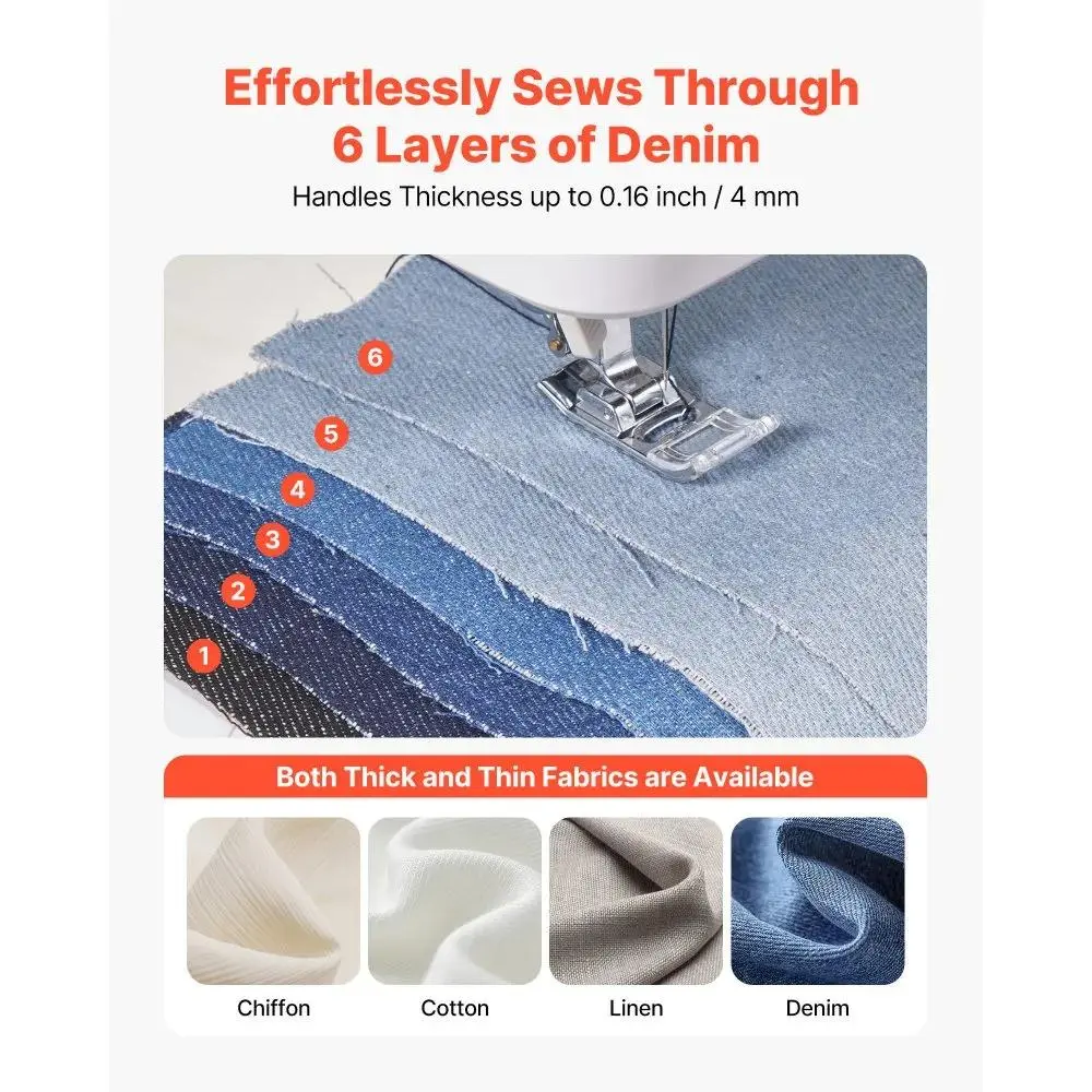 Built with a heavy-duty metal frame, stainless steel bed, and powerful motor, this digital sewing machine sews through up to 0.16 in thick fabrics. It effortlessly handles both thin chiffon and thick jeans, making it a versatile choice for various fabrics.