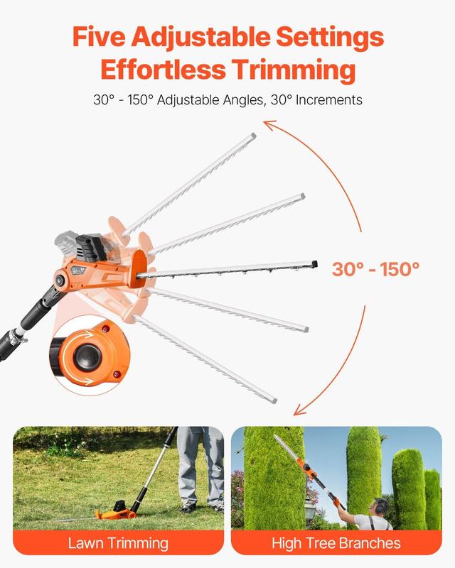 ·Adjustable for Effortless Trimming: With a telescoping range of 1.9m-2.4m, this cordless hedge trimmer allows you to trim tall hedges without a ladder. The 30°-150° five-position angle adjustment, combined with an ergonomic handle, ensures precise and effortless cutting.