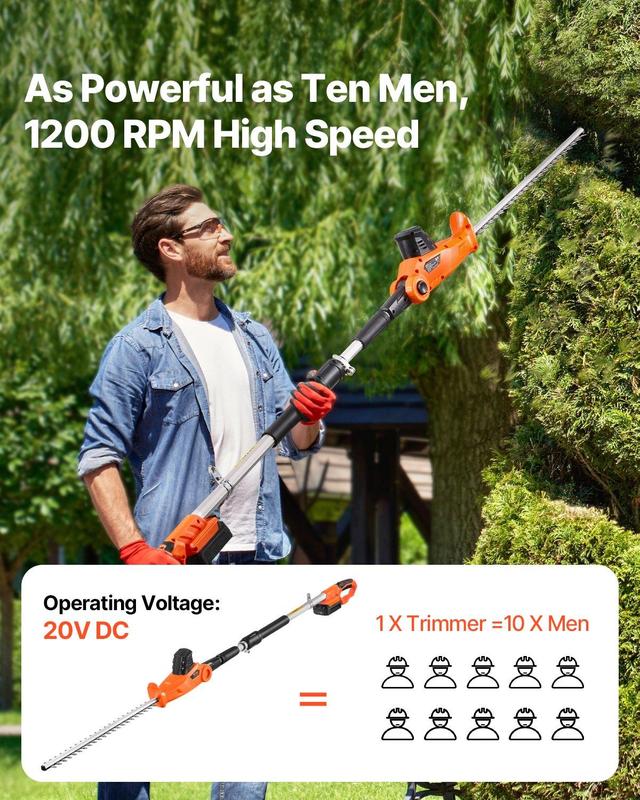 ·Cordless Design for Convenience Anywhere: Featuring a cutting-edge cordless design and a 2A high-capacity battery, the pole hedge trimmer is ideal for use in areas without power sources like gardens or orchards, eliminating the need for extension cords and boosting work efficiency.