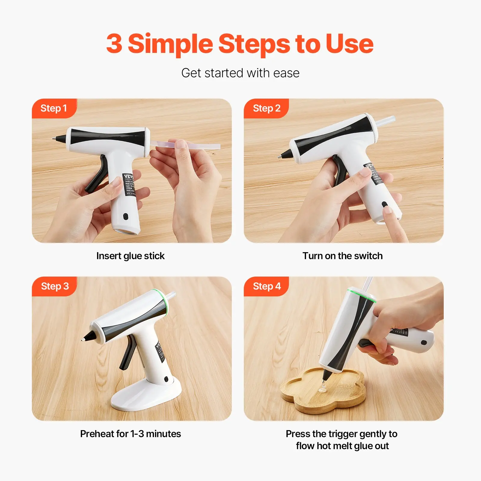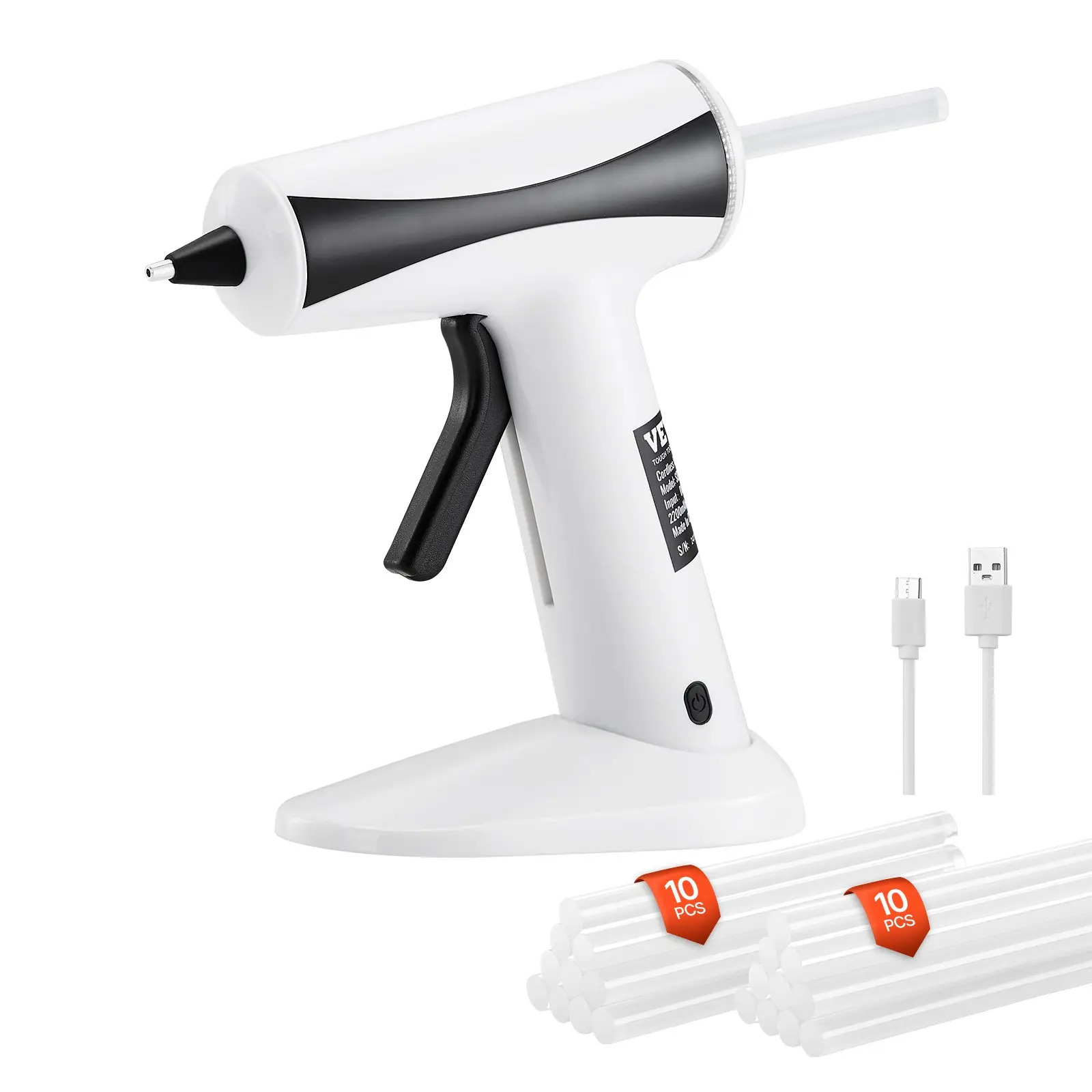 Wireless Convenience: No more cords holding you back!Our cordless hot glue gun allows you to work anywhere with ease and convenience.Enjoy greater mobility and flexibility.Super Fast Preheating: No waiting around!Featuring high-quality PI film thermosensitive technology, this cordless hot glue gun kit preheats in just 3 minutes, and its smart temperature control keeps the heat steady throughout your projects.High Capacity Battery: Equipped with a 2200mAh battery, our cordless glue gun supports hours of continuous use and charges quickly, so that you can get more done in less time.Magnetic Suction Base: Coming with a magnetic base, our cordless craft glue gun can rotate 360 degrees for effortless access.That enables you to position the glue gun exactly where you need it without extra support.Versatile for Many Uses: Great for home, office, and industrial projects. Whether it's toy making, model building, woodworking, metalworking, jewelry crafting, or repairs, our high temp glue gun can handle it all.VEVOR Hot Glue Gun, Rechargeable Cordless Glue Gun, Mini Wireless Hot Glue Gun Kit with 2200mAh Battery, 20 Pcs Glue Sticks, Fast Preheating & High Temp, for Crafts, Arts, DIY, Quick Home Repairs