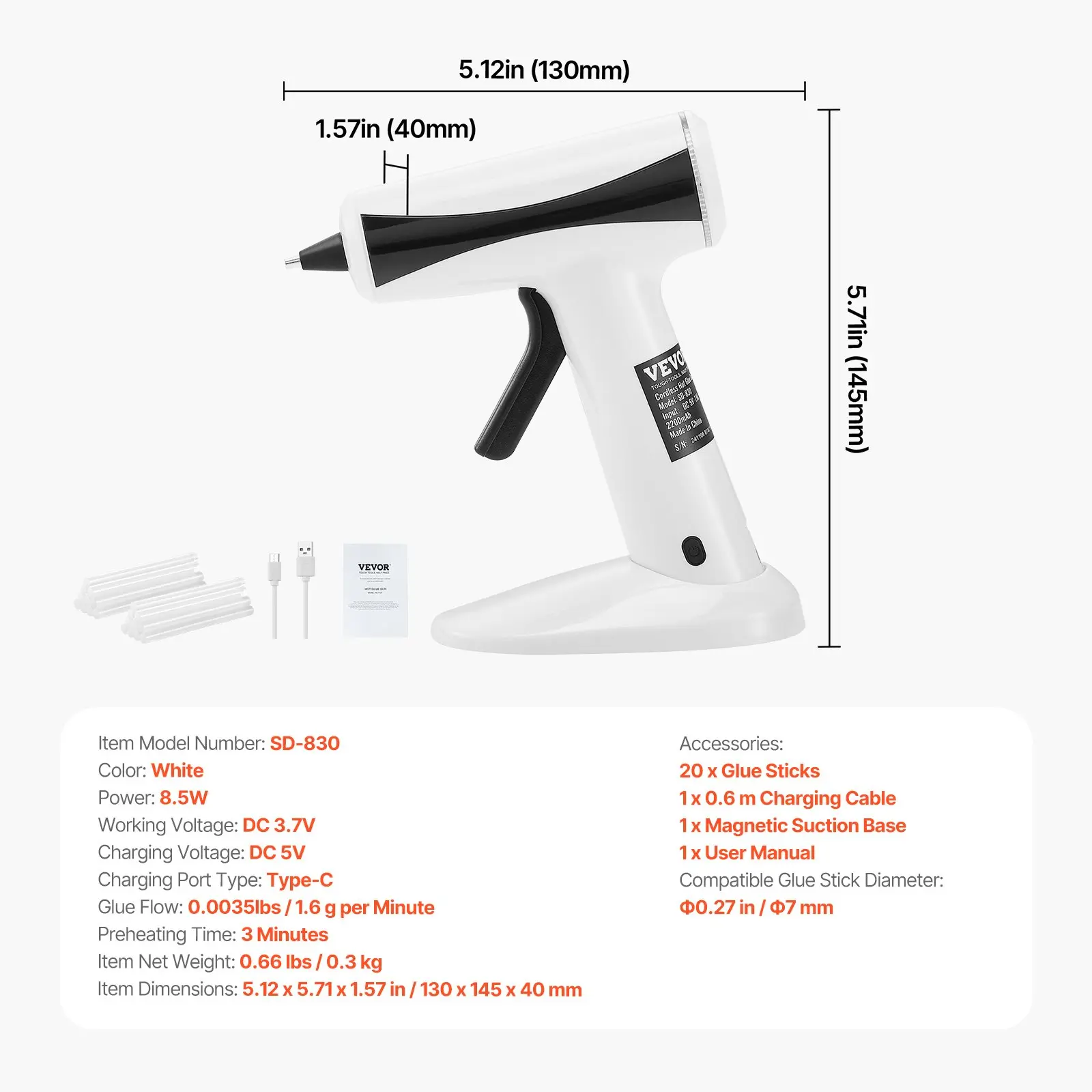 Compatible Glue Stick Diameter: Ф0. 27 in / 7 mm, Color: White, Working Voltage: DC 3. 7V,Preheating Time: 3 Minutes,Item Model Number: SD-830,Glue Flow: 0. 0035lbs / 1. 6 g per Minute,Item Net Weight: 0. 66 lbs / 0. 3 kg,Item Dimensions: 5. 12 x 5. 71 x 1. 57 in / 130 x 145 x 40 mm, Power: 8. 5W,Charging Port Type: Type-C,Charging Voltage: DC 5V