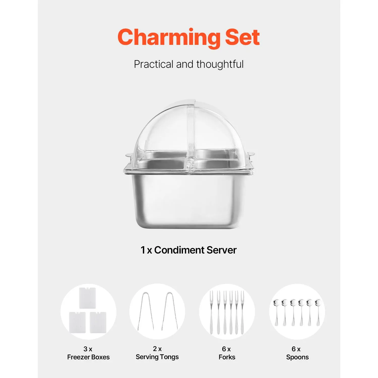 ·Elegant & Practical Set: Our buffet condiment dispenser display rack includes 3 freezer boxes, 2 stainless steel tongs, 6 304 stainless steel fruit forks, 6 304 stainless steel spoons, and 5 silicone mats. It provides practicality and elegance, making dining experiences more convenient and stylish
