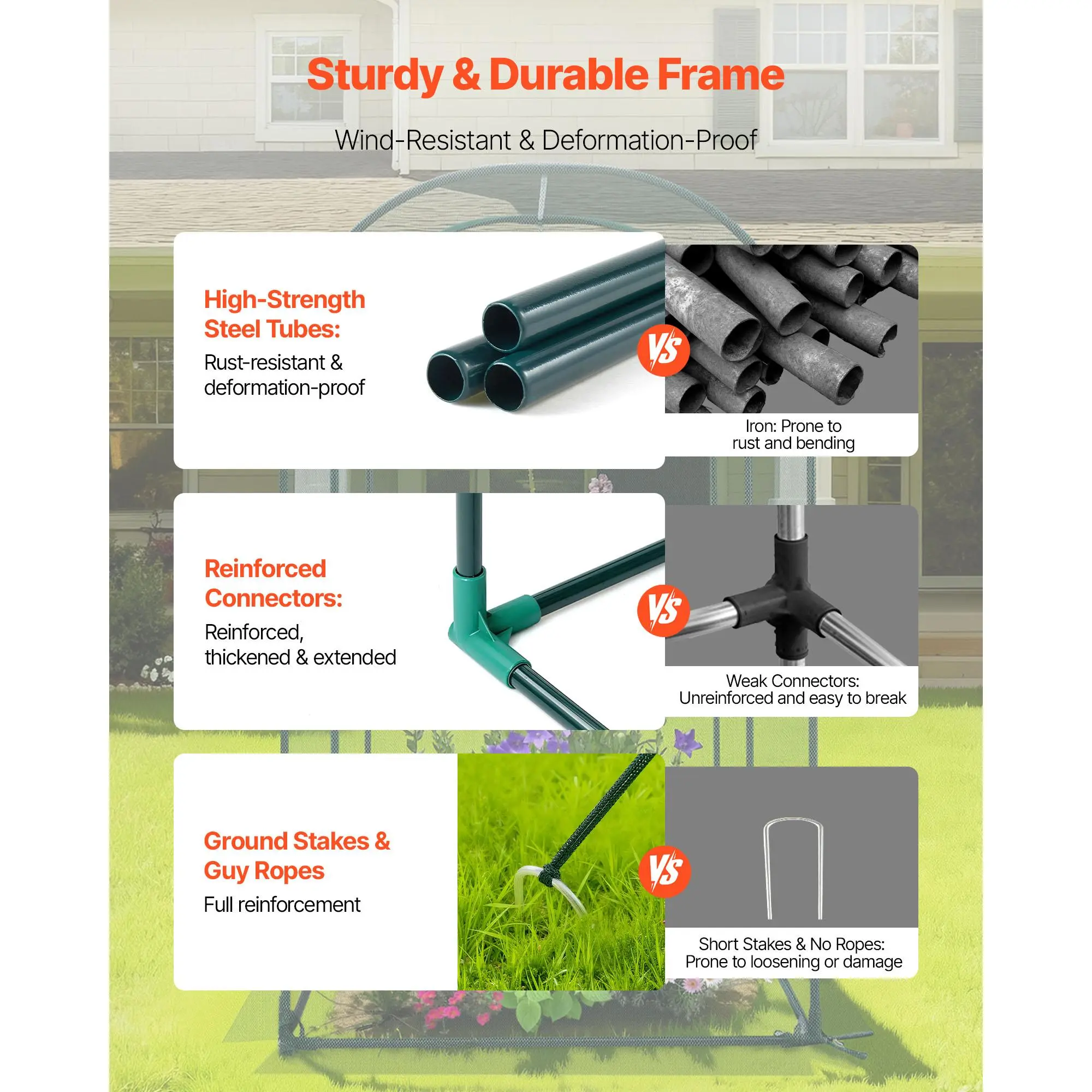 • Stable & Wind-Resistant: Made of powder-coated steel tubes, our plant protection tent is rust- and corrosion-resistant. Reinforced plastic joints fit snugly with the main frame, while U-shaped ground stakes and guy ropes provide wind resistance