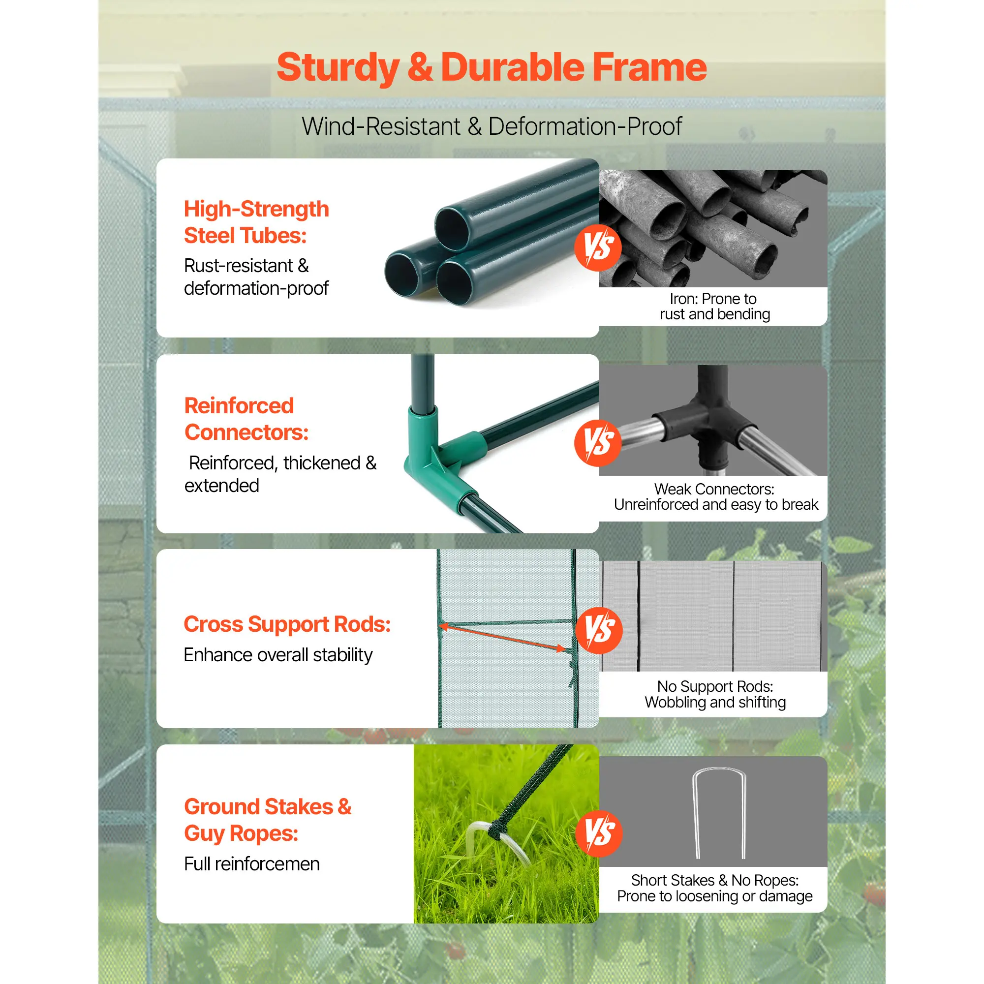 • Stable & Wind-Resistant: Made of powder-coated steel tubes, our plant protection tent is rust- and corrosion-resistant. Reinforced plastic joints and side support rods add stability, while U-shaped ground stakes and guy ropes provide wind resistance