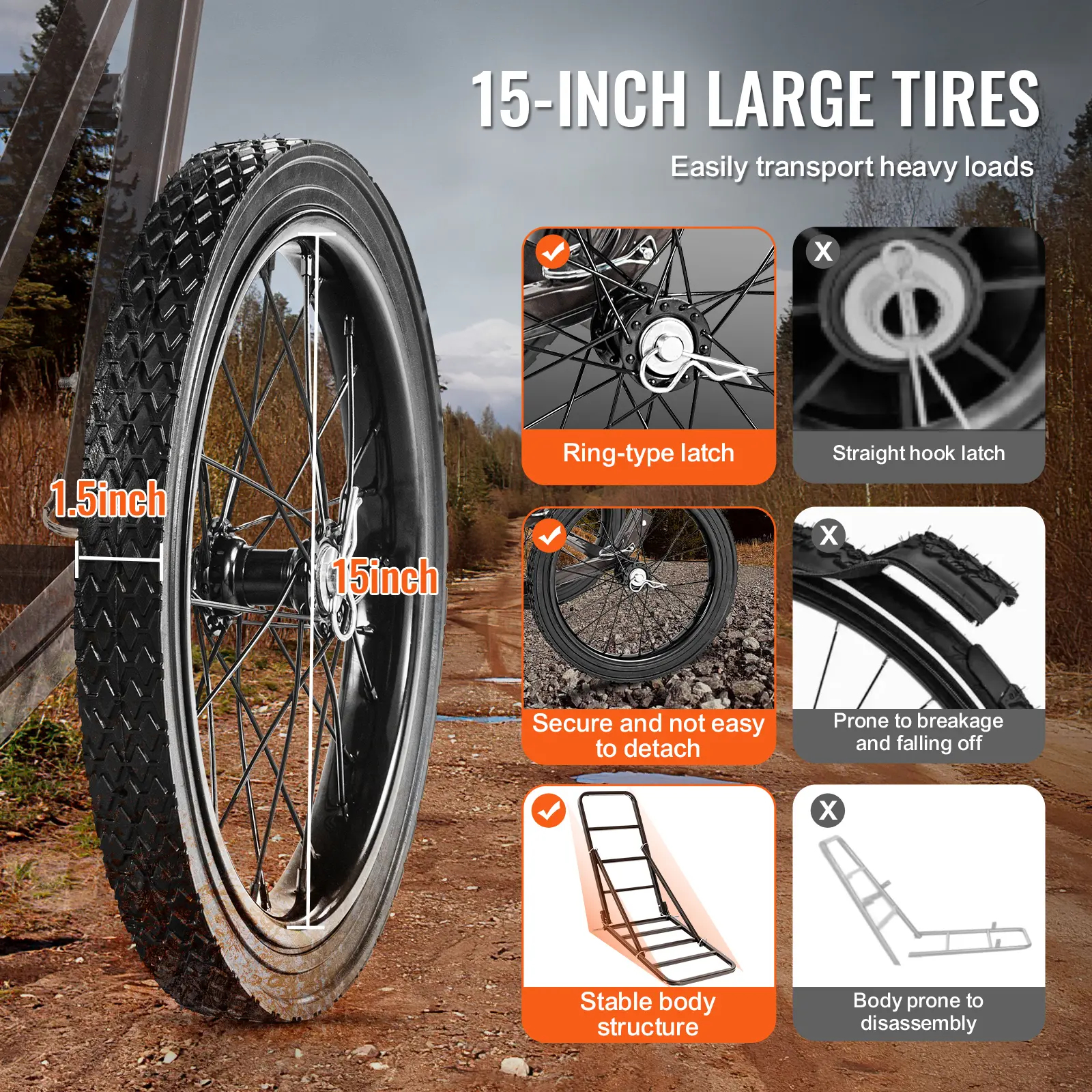 • Solid Rubber Tires: Unlike inflatable tires, this folding game cart uses 15-inch solid rubber tires, avoiding the risk of punctures and air leaks, and offering resistance to various terrains. With a larger tire diameter, transportation becomes easier and more flexible. Additionally, the tire's hitch pin features a ring-lock design, providing better security compared to conventional straight hook connections, ensuring the stability of the cart and preventing disassembly.