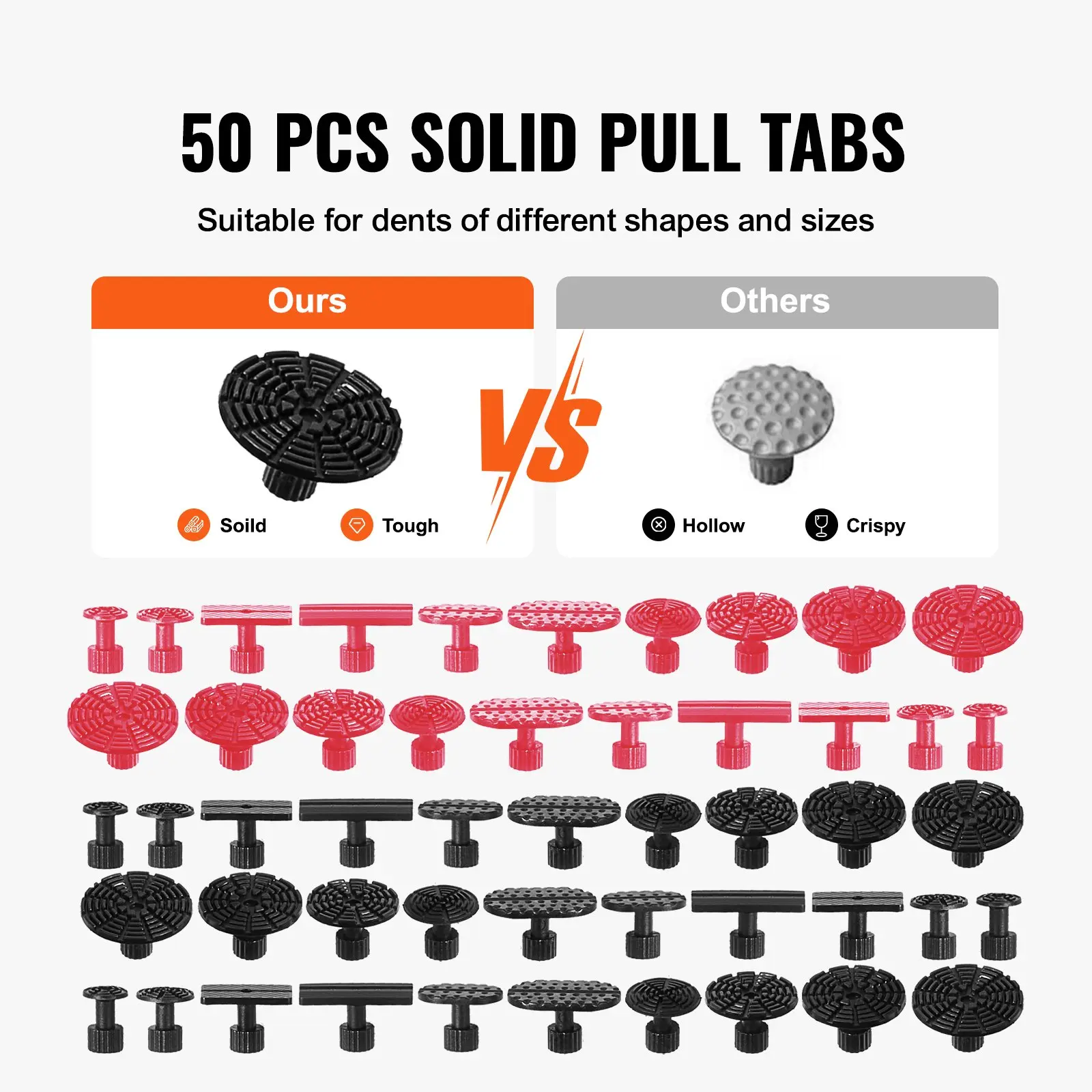 50 pcs dent puller tabs of different sizes are great for various dents. And all tables are made of high-quality materials, more difficult to fall off during use, and more durable.