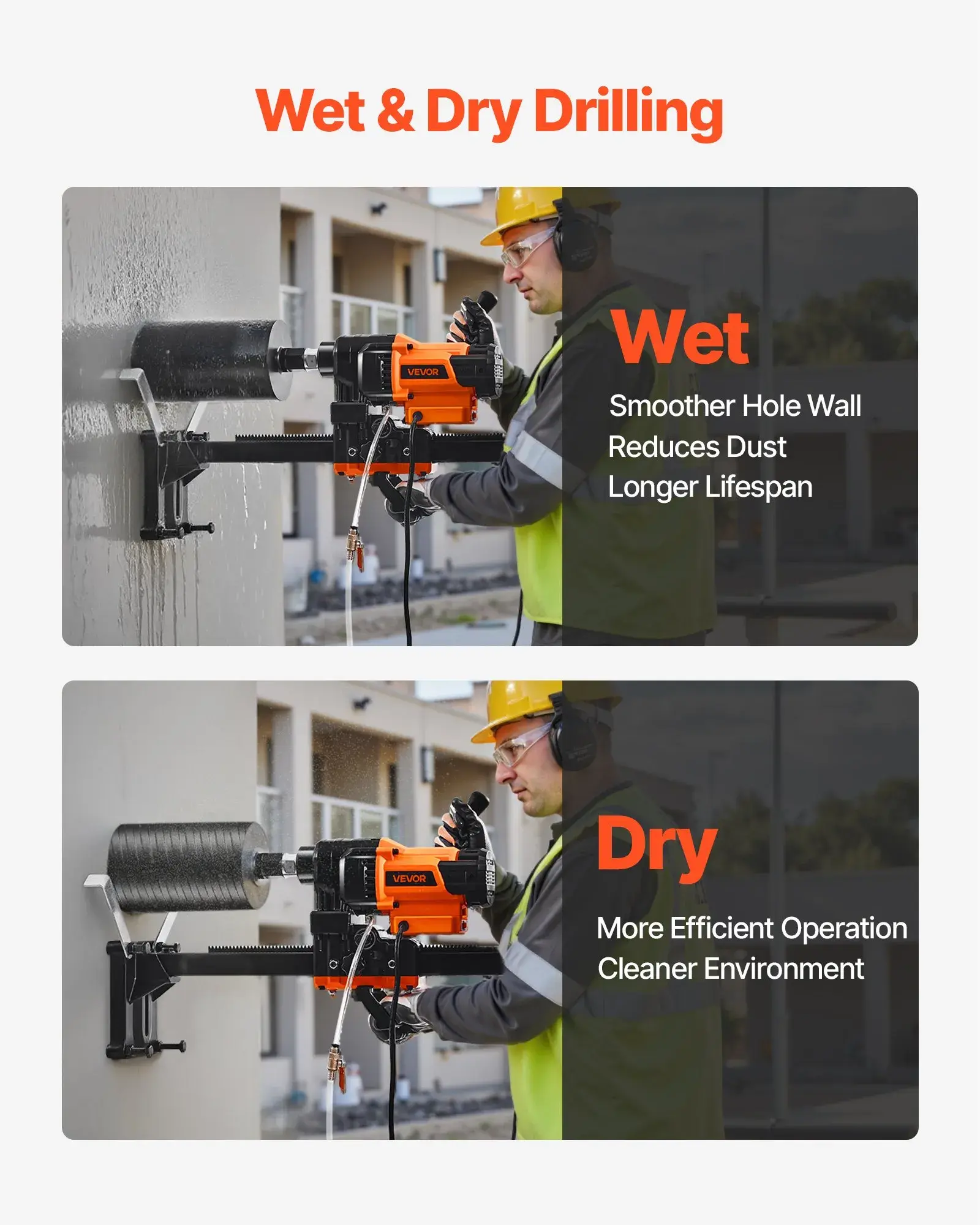 ·Superior Hole Quality: Our diamond core drilling machine features both wet and dry drilling. The wet drilling option flushes out debris and cools the bit with water, reducing dust and improving hole smoothness—great for indoor renovation work