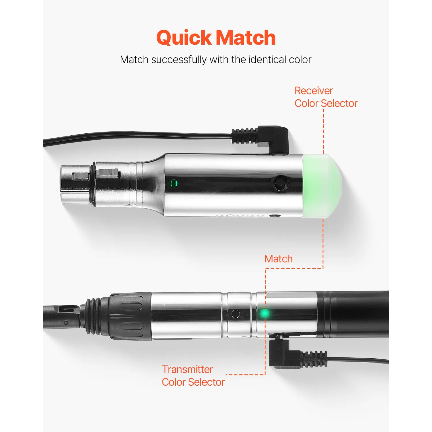 • Easy Match Indicator: Both the wireless DMX receiver and transmitter have indicator lights. With 7 signal light options, simply match the same colors to pair them. Easy-to-understand connectors make for quick learning and immediate use.