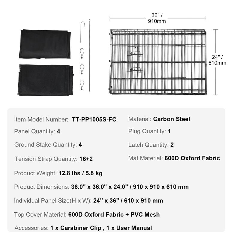β’ Versatile Use: This dog playpen is composed of 4 panels that form a spacious 36" x 36" square. The door opens all the way to the top, and the top cover can be opened with a zipper, allowing for easy access for the owner.