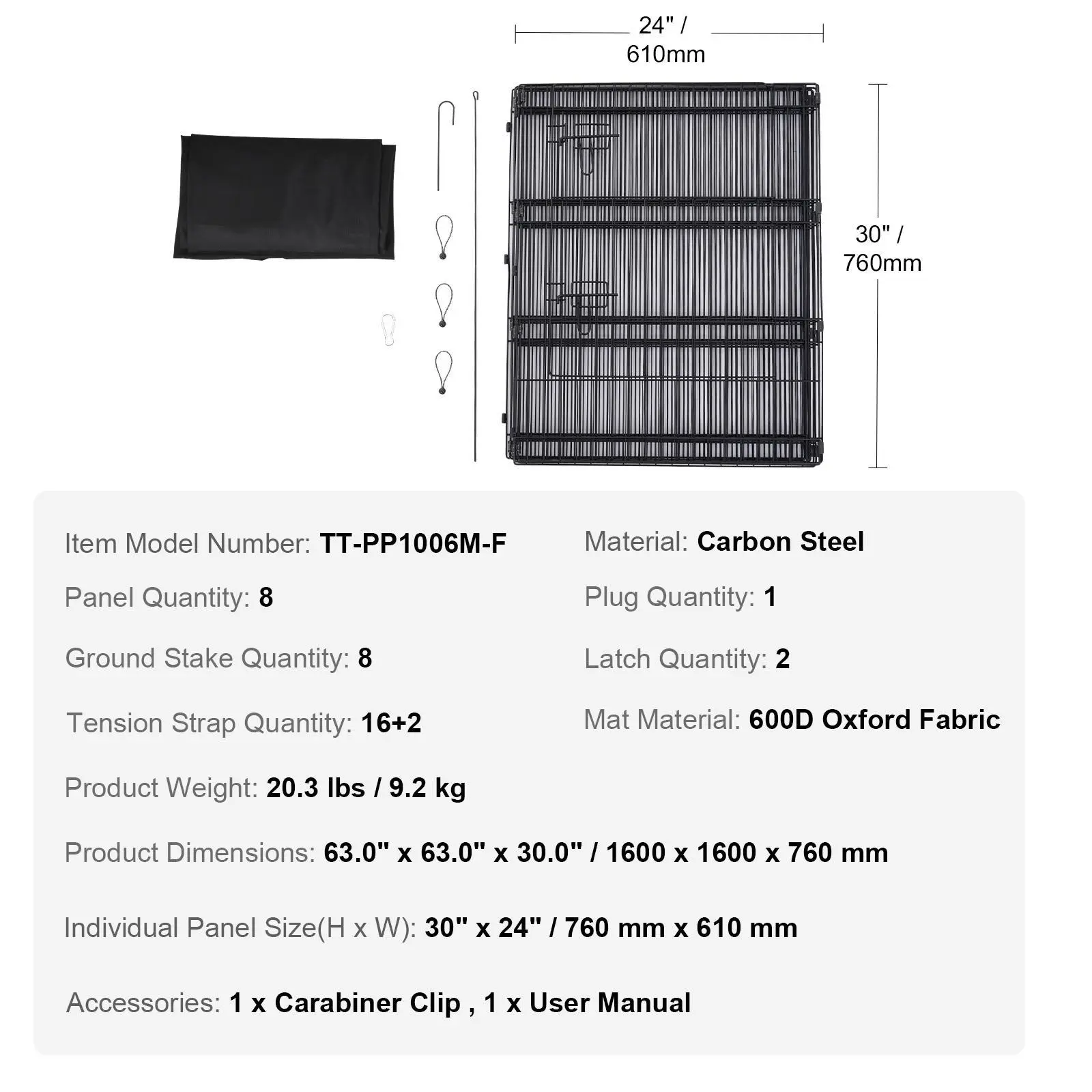 • Versatile Use: This dog playpen is composed of 8 panels that can be arranged into a 24" side-length octagon, providing a spacious area for pets. The door opens all the way to the top, allowing easy access for the owner.
