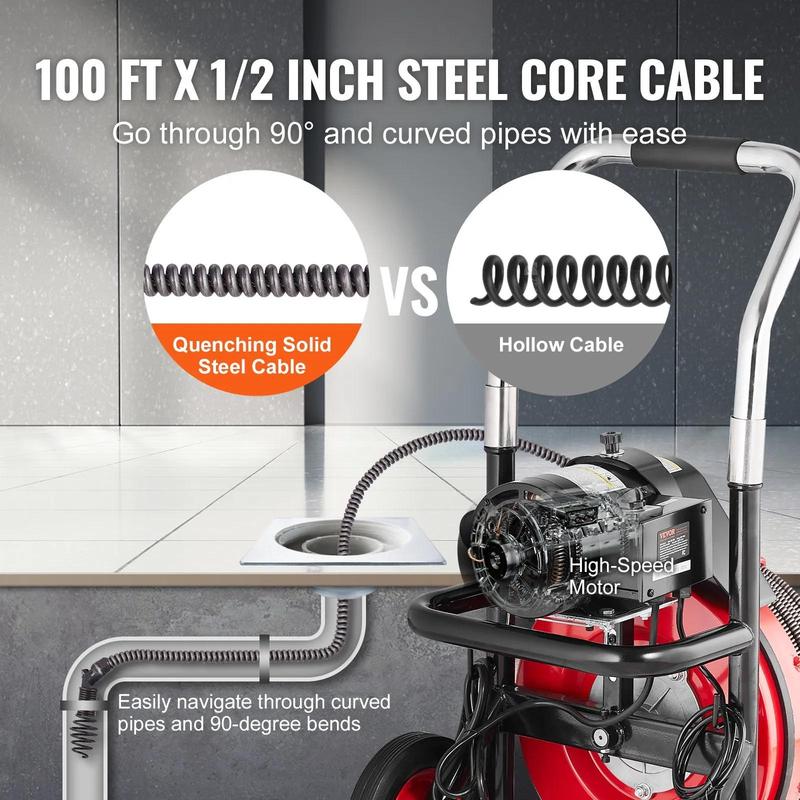 VEVOR Drain Cleaner Machine 100FT x 1/2 Inch,  , Auto Feed Sewer Snake Auger on Wheels, 550W Portable Drain Cleaning Machine with 8 Cutters & Air-activated Foot Switch for 2" to 4" Pipes