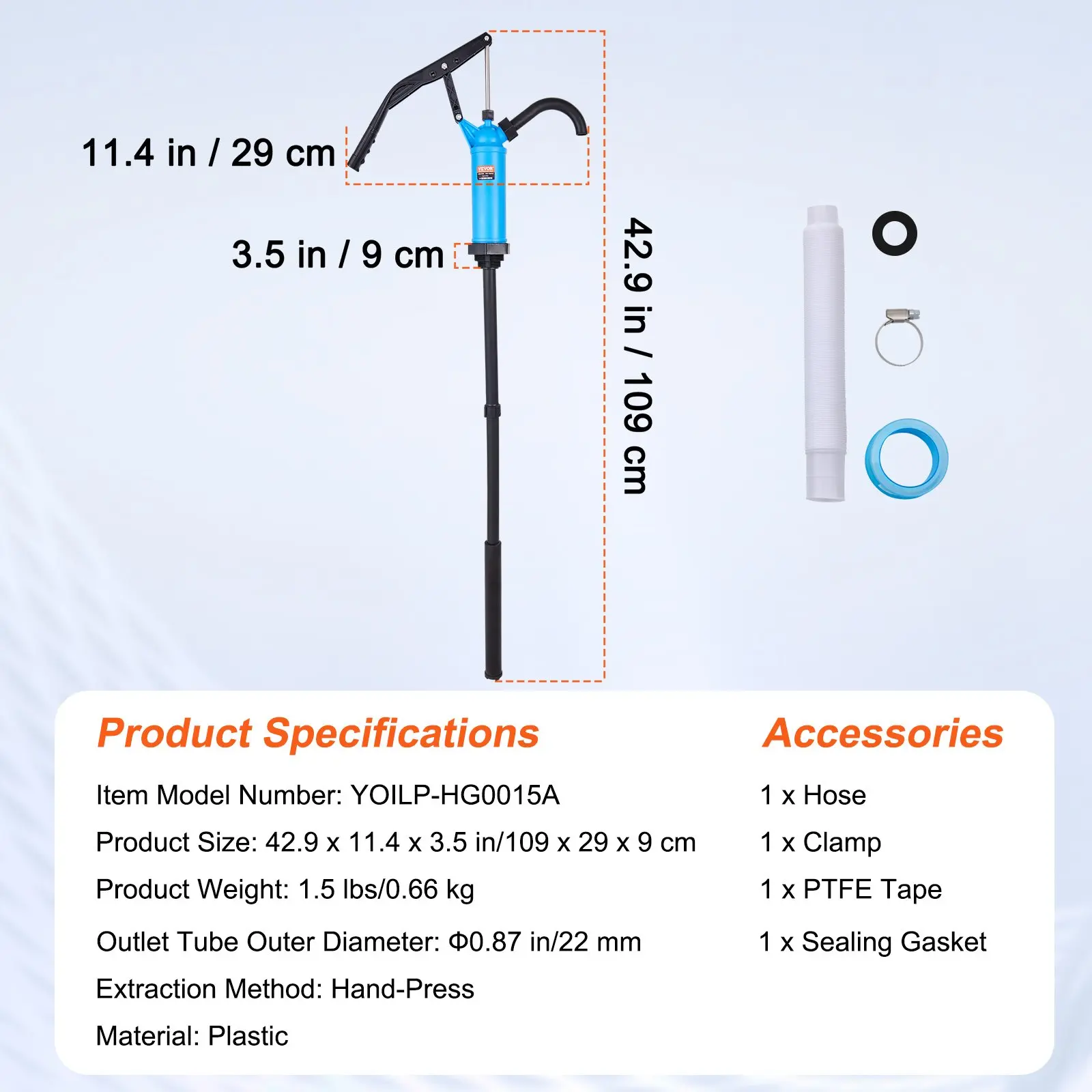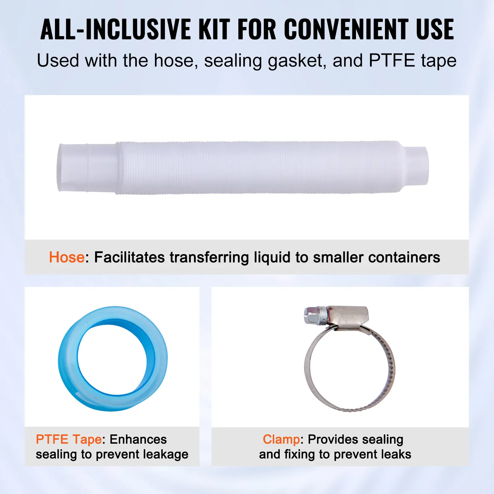 • An Ensemble of Extras: No more surprise trips to the hardware store. Our pail pump comes with a hose, hose clamp, and PTFE tape, ensuring an airtight seal to prevent any pesky leaks. All you need for a smooth and seamless liquid transfer experience.