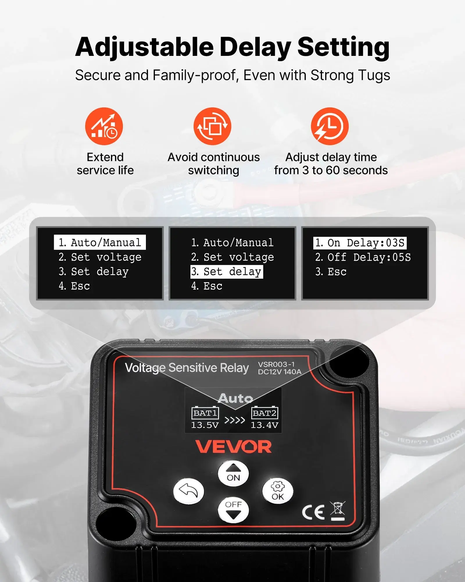 ·Intelligent Delay Function: With an adjustable delay time of 3-60 seconds, this VSR isolator effectively avoids frequent switching, significantly extending the service life of the isolator and battery