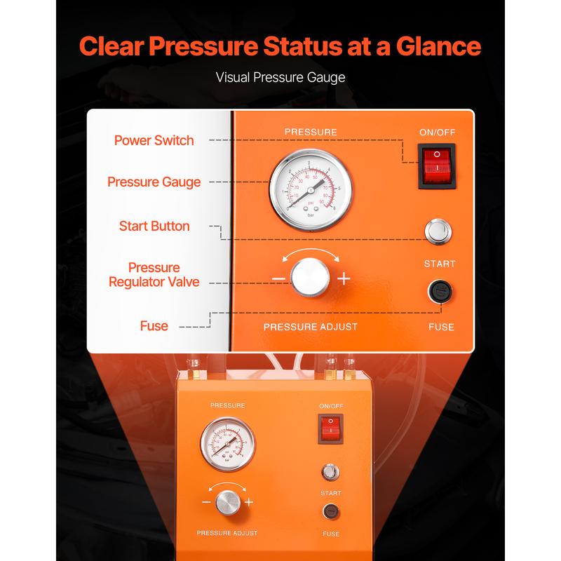 • Adjustable Pressure: The pressure can be set between 0.6 to 3.0 bar. Increase pressure for faster operation or lower it to avoid reservoir damage. The visual pressure gauge allows easy monitoring of the pressure levels.