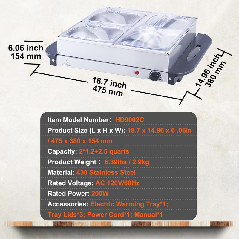 VEVOR's heating tray can heat the food within 15 minutes. The stainless steel material is not only heat-resistant, but also stable. It has a removable dinner plate for storing food or directly heating the dishes. Not only can be used in daily dining, but also a good partner for parties.