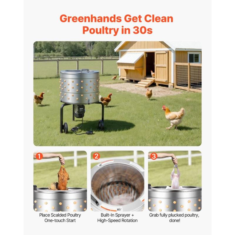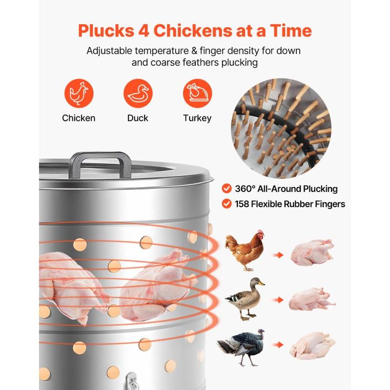VEVOR Chicken Plucker Machine, 15.7 in Drum, 550W 275RPM Electric Chicken Plucking Machine with 114 Soft Fingers Transport Wheels, Stainless Steel Feather Remover for Processing 1 - 2 Chicks OnceVEVOR Chicken Plucker Machine, 25.6 in Drum, 1200W & 275RPM Electric Chicken Plucking Machine with 158 Soft Fingers & Transport Wheels, Stainless Steel Feather Remover for Processing 4 Chicks Once 158 Independent Rubber Fingers High-Quality Materials High Quality Planetary Gear