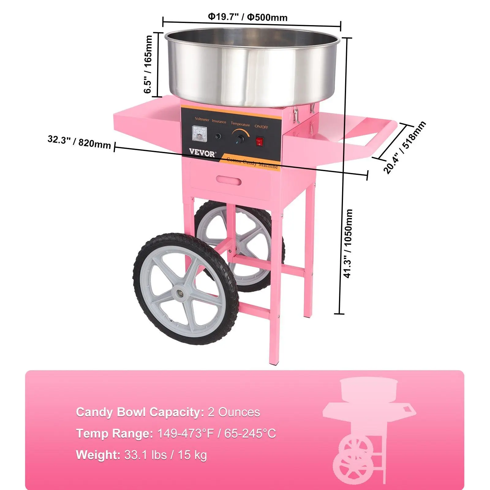 VEVOR Electric Cotton Candy Machine with Cart,  1000W Commercial Floss Maker with Stainless Steel Bowl, Sugar Scoop and Drawer, Perfect for Home, Kids Birthday, Family Party, Pink