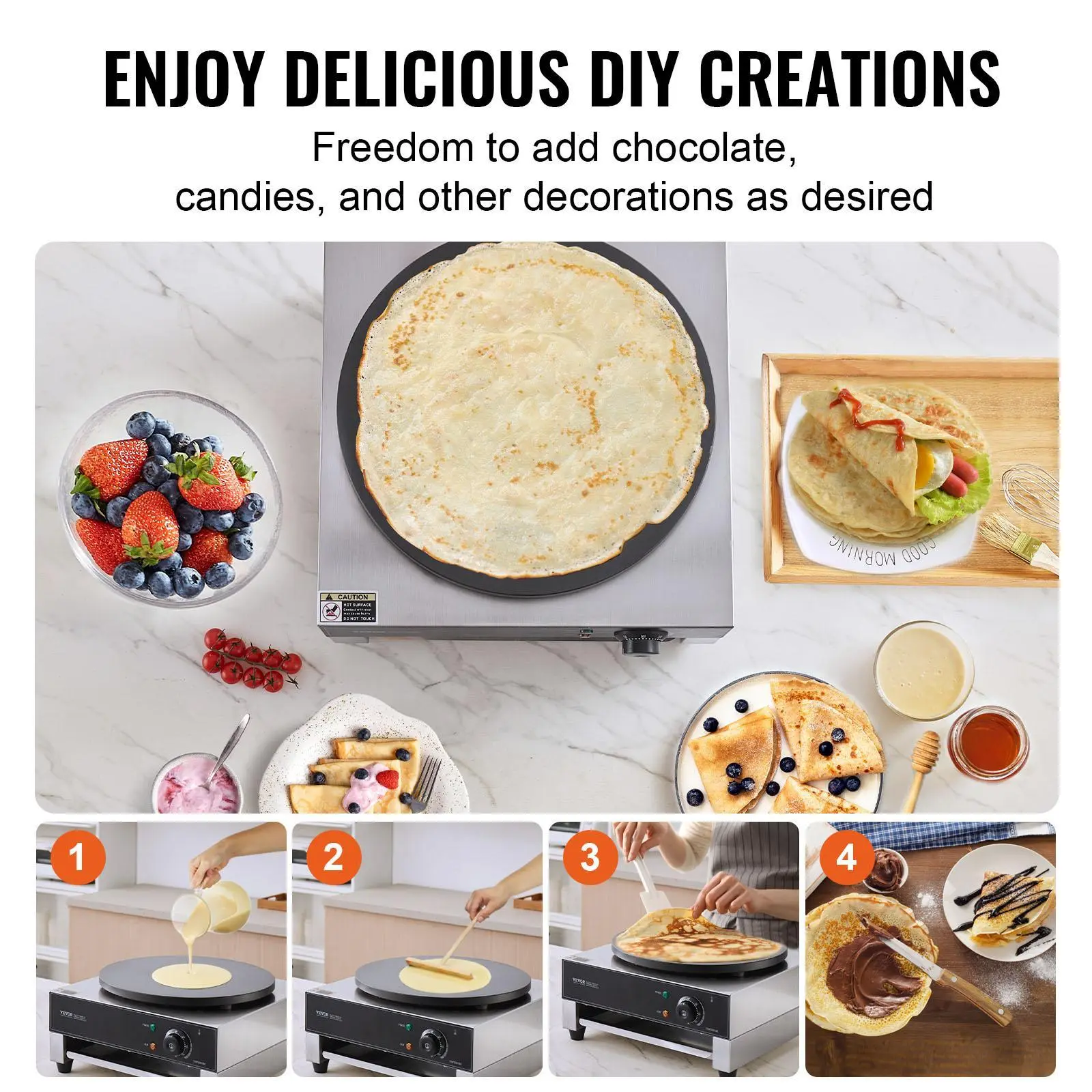 • Quickly Make Delicious Crepes: Our 1700W high-power electric crepe maker features a large 400mm (16-inch) diameter heating plate, making it easy to create delicious waffles and saving you significant time, providing an effortless breakfast experience. Evenly distributed heating elements ensure your waffles are evenly baked. Get ready to enjoy waffles stuffed with your favorite fillings.