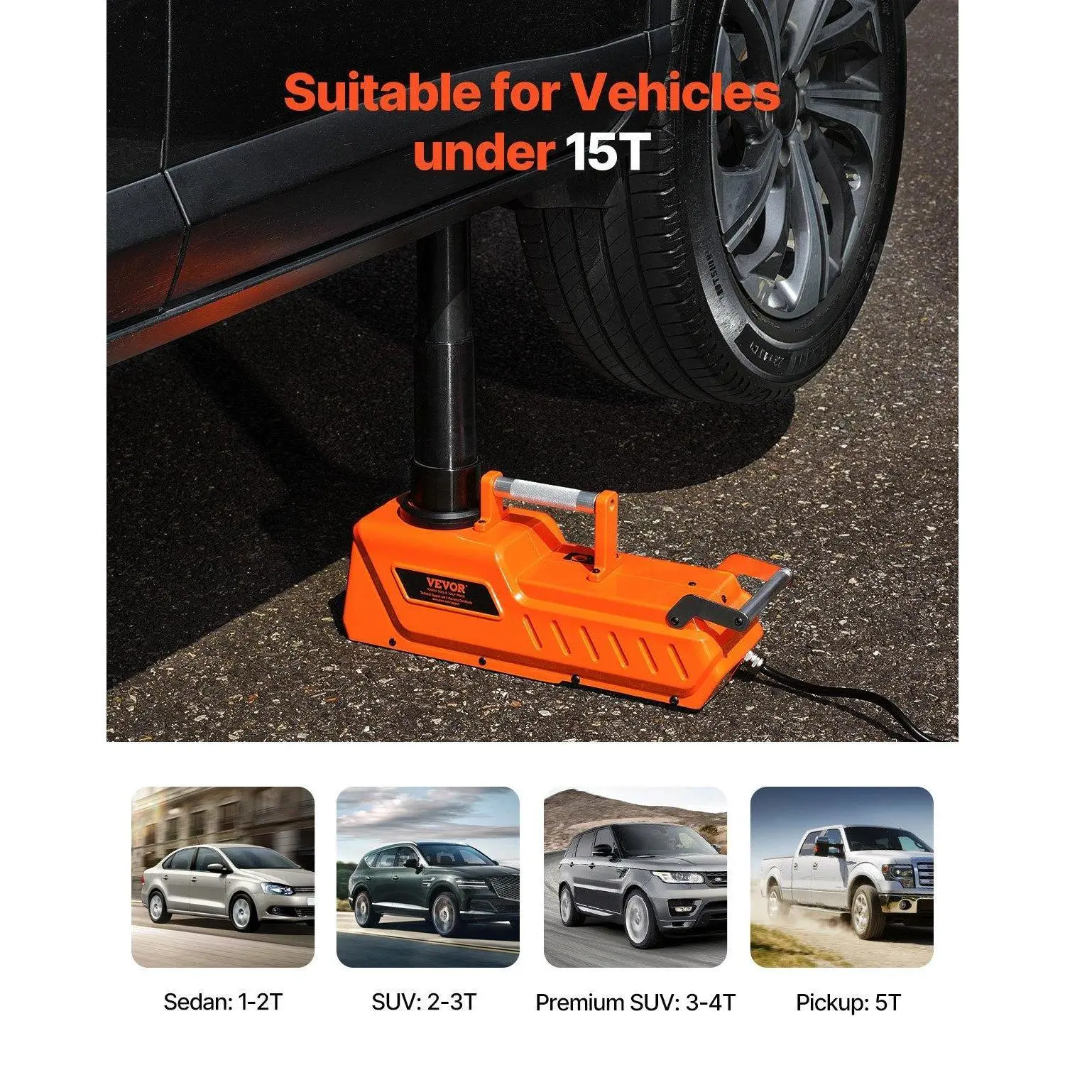 ·For 15T Vehicles: This electric jack is designed for hydraulic lifting of single tires on vehicles up to 15T, making it easy to reach for cars, SUVs, and more. Note: The jack must be used on a flat surface and positioned vertically with your vehicle.