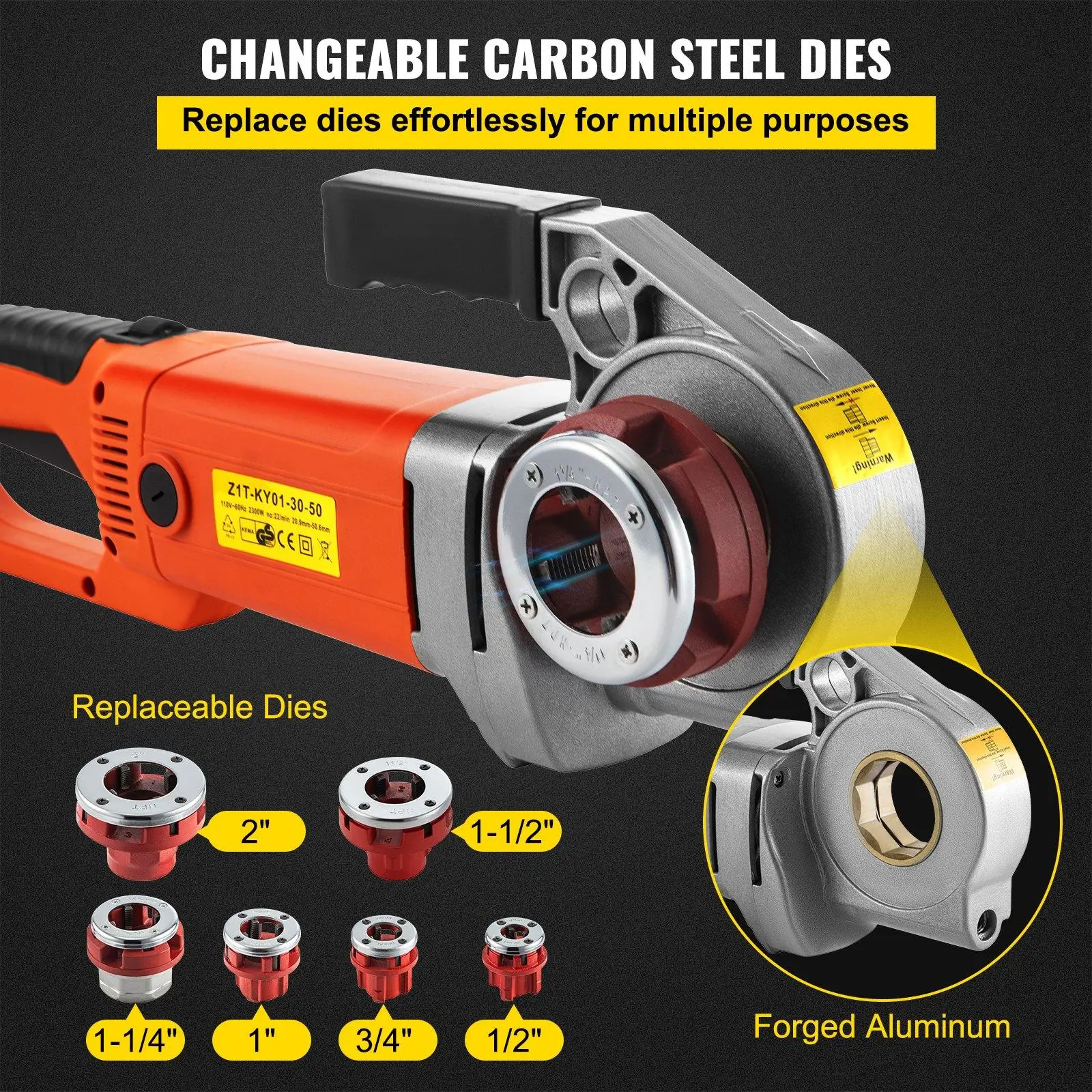 ·CHANGEBLE DIES 1/2"-2" - 6 Die Heads and Dies Included: 1/2", 3/4", 1", 1 1/4", 1 1/2", 2". Our pipe threading machine adopts carbon steel dies, long life, clear thread. Die heads can be quickly replaced.