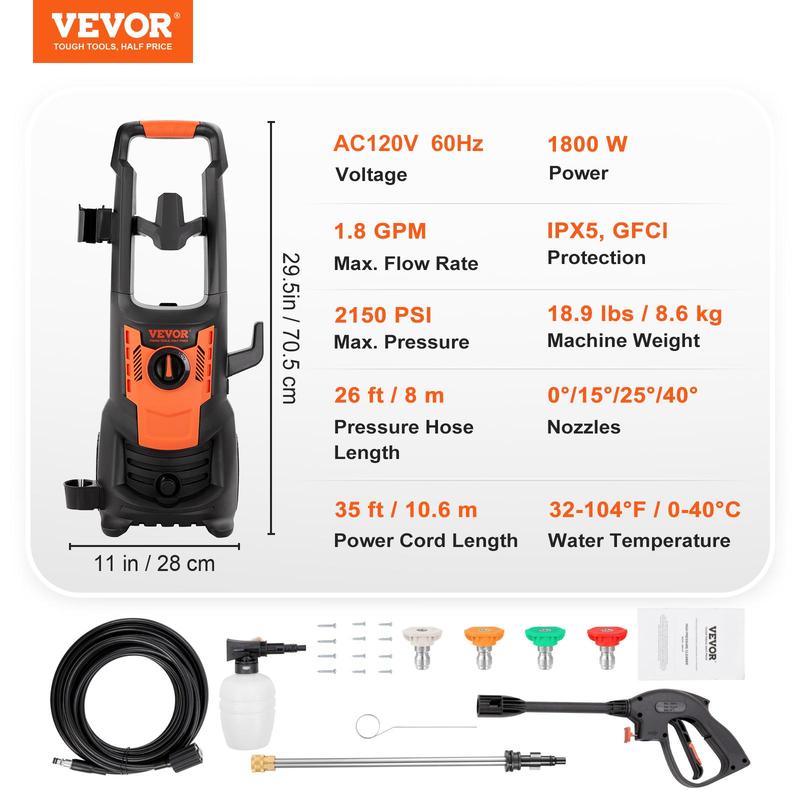 ·2150PSI High-pressure Washer: Built with a powerful 1800 W motor that generates a high water flow rate of up to 1.8 GPM. Hence, electric pressure washer can completely clean up old paint, oil, weed, and other stubborn stains. Ideal for homes, RVs, patios, fences, decks, driveways, cars, lawn equipment, etc. Automatically stops working when temperatures reach over 266℉, ensuring ultimate security and consistent high quality performance.