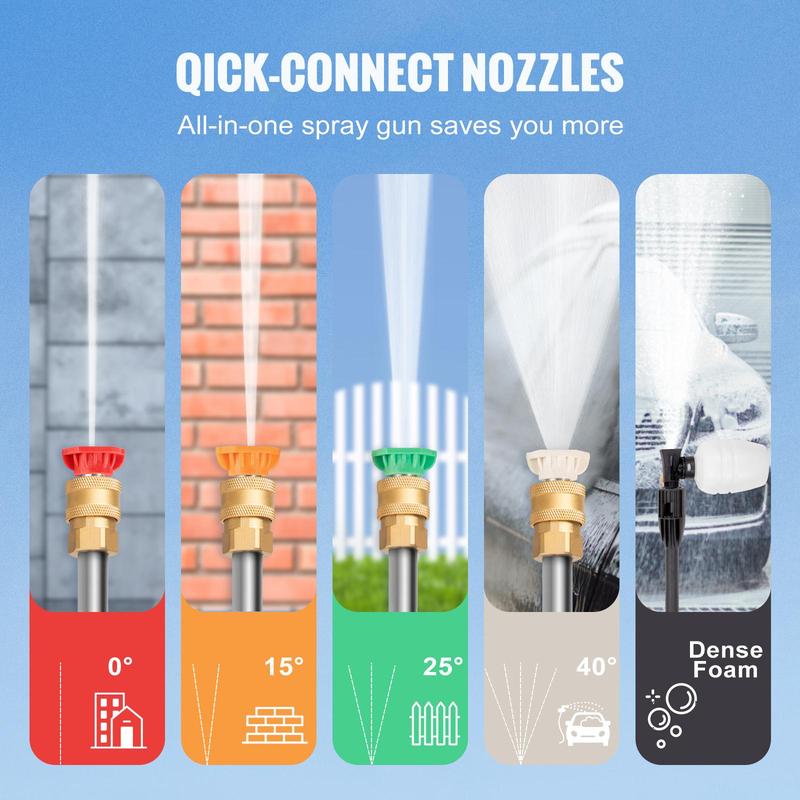 ·4 Nozzles for Different Jobs:The pressure washer provides 4 quick-connect metal spray nozzles ( 0°/ 15°/ 25°/ 40°) and a 500 ml self-spraying detergent bottle for best suiting your different cleaning tasks. The water inlet filter makes the water nozzles spray smoothly without any blockage. Therefore, you do not need to change nozzles frequently, saving unnecessary expenses.