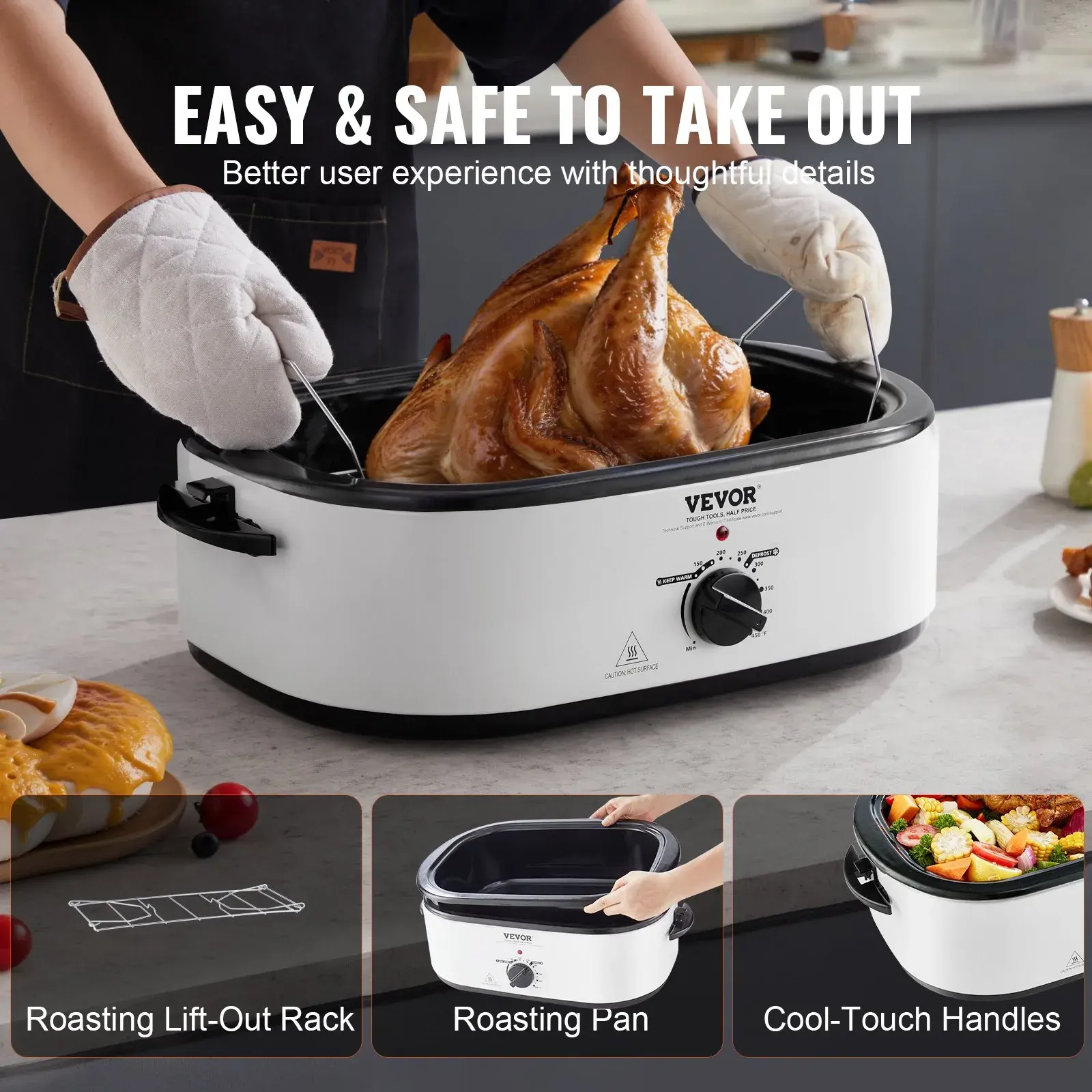 5. VEVOR Electric Roaster Oven, 22 QT Turkey Roaster Oven with Self-Basting Lid, 1450W Roaster Oven with Defrost & Warm Function, Adjustable Temp, Removable Pan & Rack, Fits Turkeys Up to 26LBS, White
