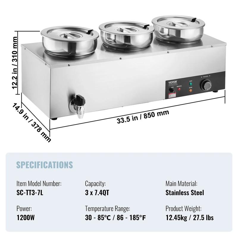 Elevate your dining experience with the VEVOR Electric Soup Warmer. It features three 7.4QT stainless steel round pots, perfect for buffets and restaurants. This commercial food warmer operates at 1200W, ensuring efficient heating. The adjustable temperature range of 86~185°F allows for versatile use. Ideal for maintaining soup and dish temperatures, it's a must-have for any establishment.