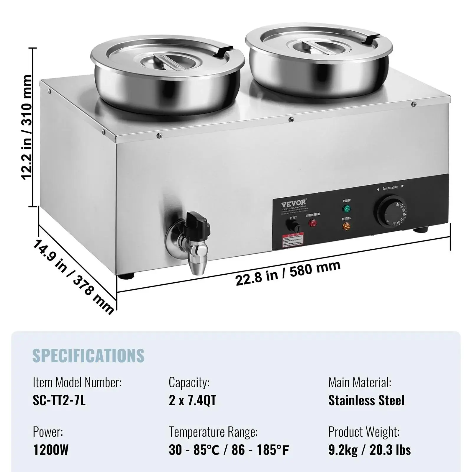 Elevate your dining experience with the VEVOR Electric Soup Warmer. This commercial-grade unit features a dual 7.4QT stainless steel round pot. It's perfect for restaurants and buffets, ensuring your food stays warm. The 1200W power output keeps dishes at 86~185°F, adjustable for various needs.