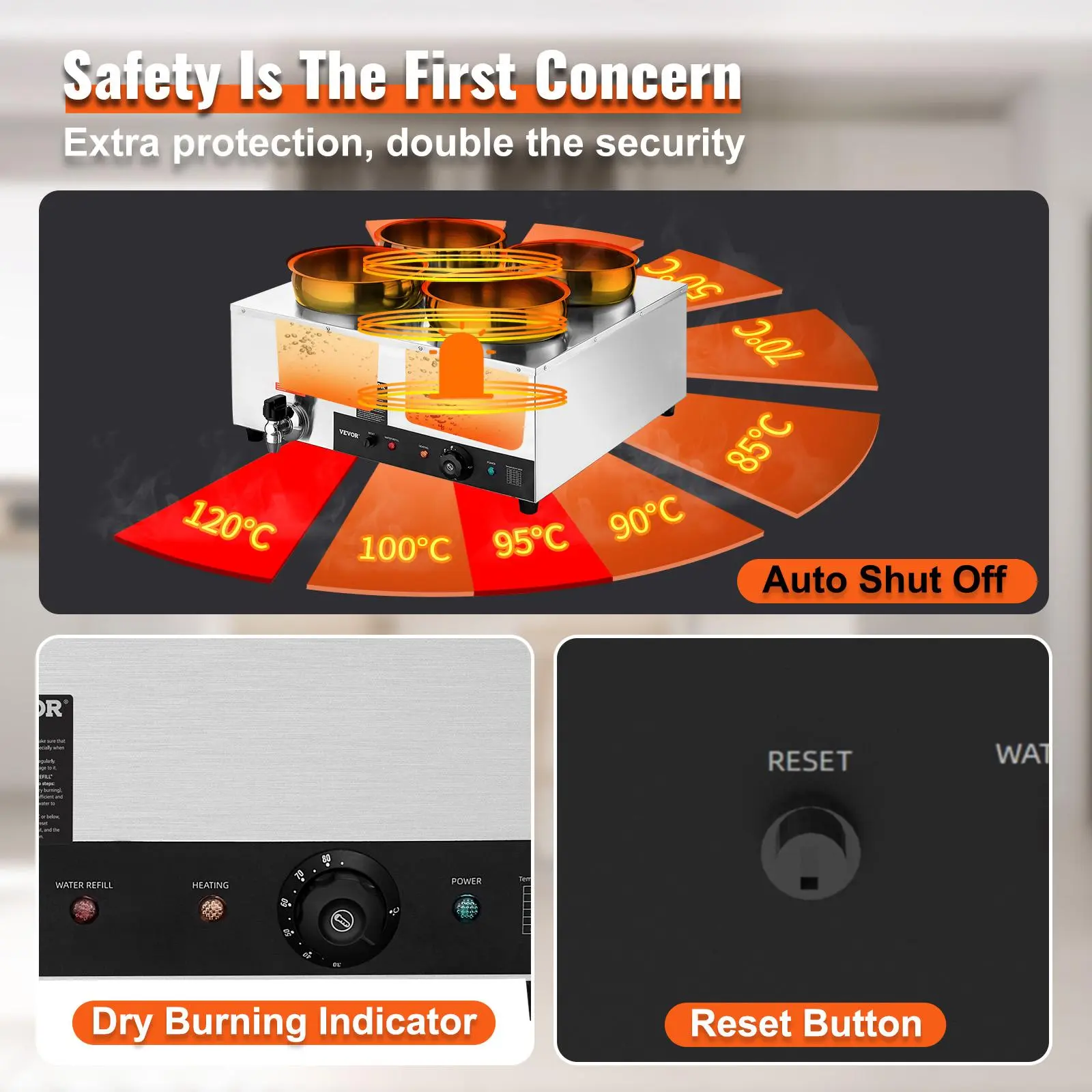 • Additional Security: We have upgraded our food warmer with newly designed “Dry Burning Indicator” and “Reset Button”. The dry-burning indicator function automatically stops heating the food when the temperature exceeds 248°F (120°C). To resume operations, simply refill the water and press the Reset Button.