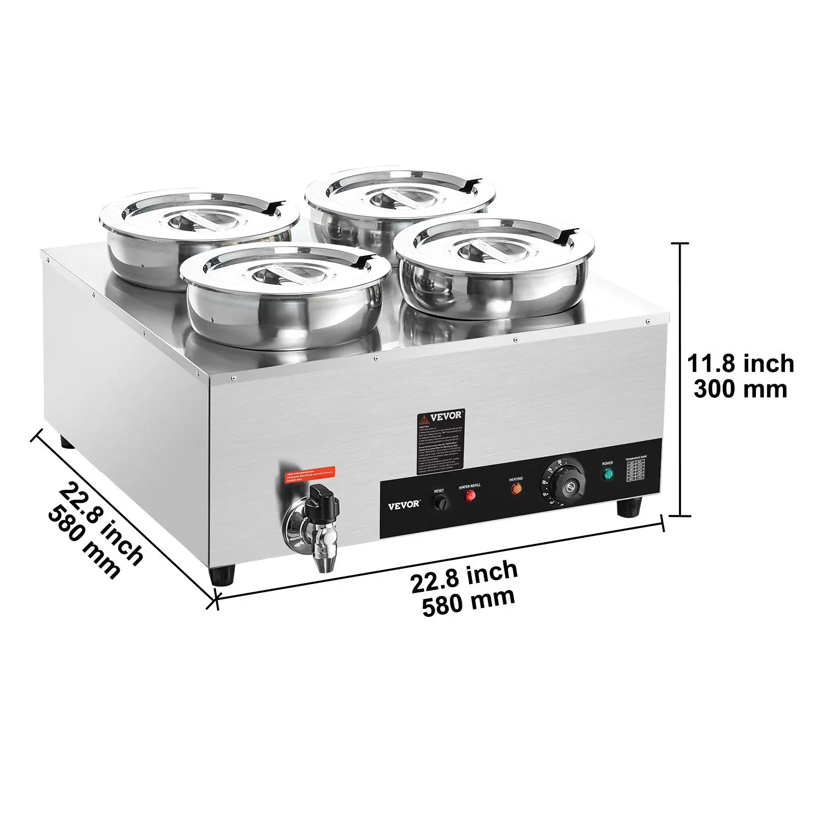 • Includes Four 7.4Qt Soup Pots: Our commercial soup warmer comes equipped with four 7.4Qt round pots (each 8.7" deep) accompanied by their respective lids, allowing you to serve four different dishes simultaneously. Feel free to change up your menu from soups and sauces to stew, or even nacho cheese and chocolate.