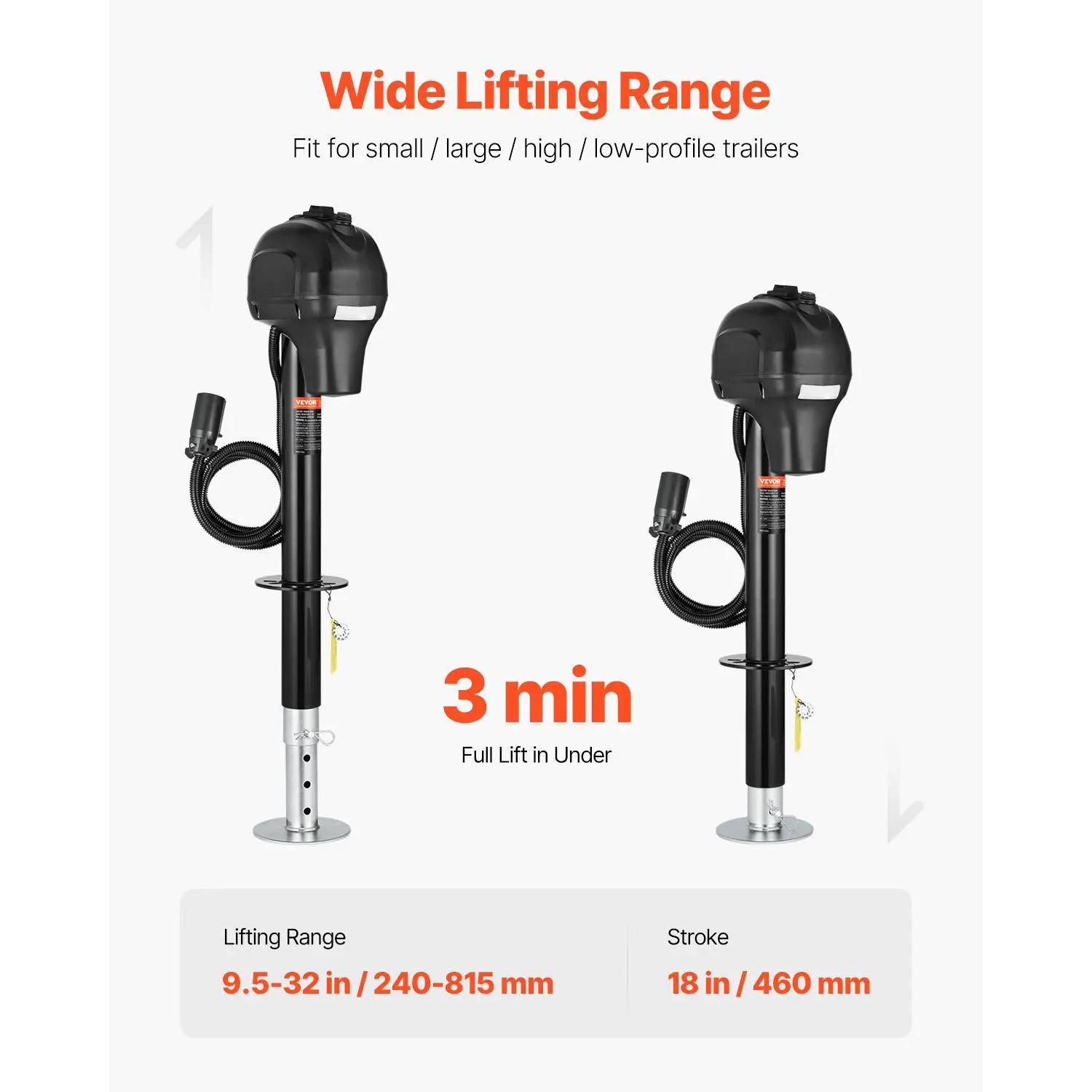 • Heavy-Duty Load Capacity: The VEVOR electric trailer jack boasts an impressive lifting capacity of 3500 lbs and a lifting range of 9.5 to 32 inches.