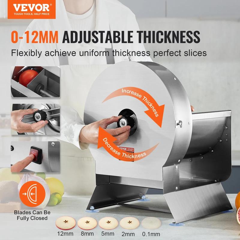 ConclusionThe VEVOR Electric Vegetable Slicer is a versatile and efficient kitchen tool, perfect for both professional and home use. Its adjustable thickness, durable blades, and smooth operation make it an essential prep tool for any kitchen.