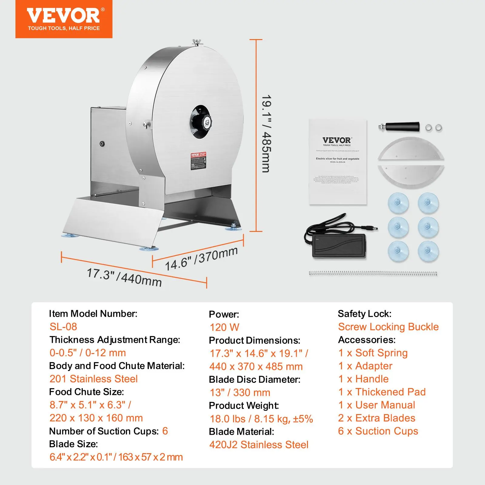 • Smooth and Efficient: The food chute measures 8.7" x 5.1" x 6.3", accommodating common ingredients such as potatoes, lemons, cabbages, carrots, and cheese. It allows for easy slicing of various foods, regardless of their softness, size, or hardness. In electric mode, the spring lever automatically pushes the food forward for slicing. The vegetable cutter also includes a soft spring, preventing tomatoes, kiwis, and cheese from being flattened. Six suction cups prevent any movement during use.