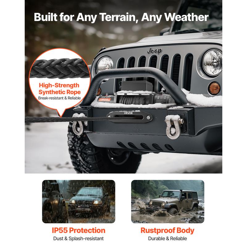 • All-Weather Durability: The 3/8 in x 85 ft synthetic rope resists sunlight, wear, and breakage. The IP55 sealed alloy body protects against dust, rain, and harsh terrain.