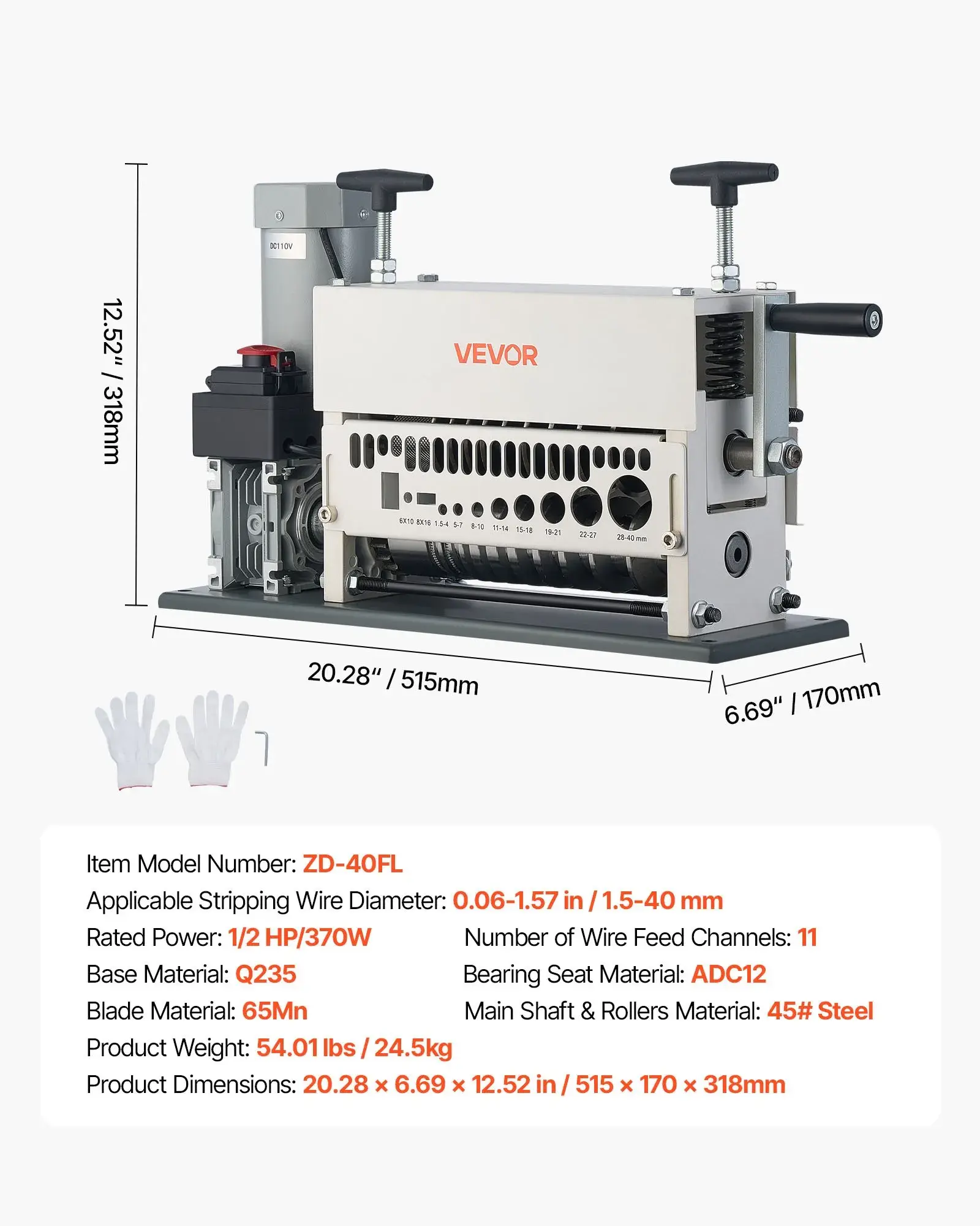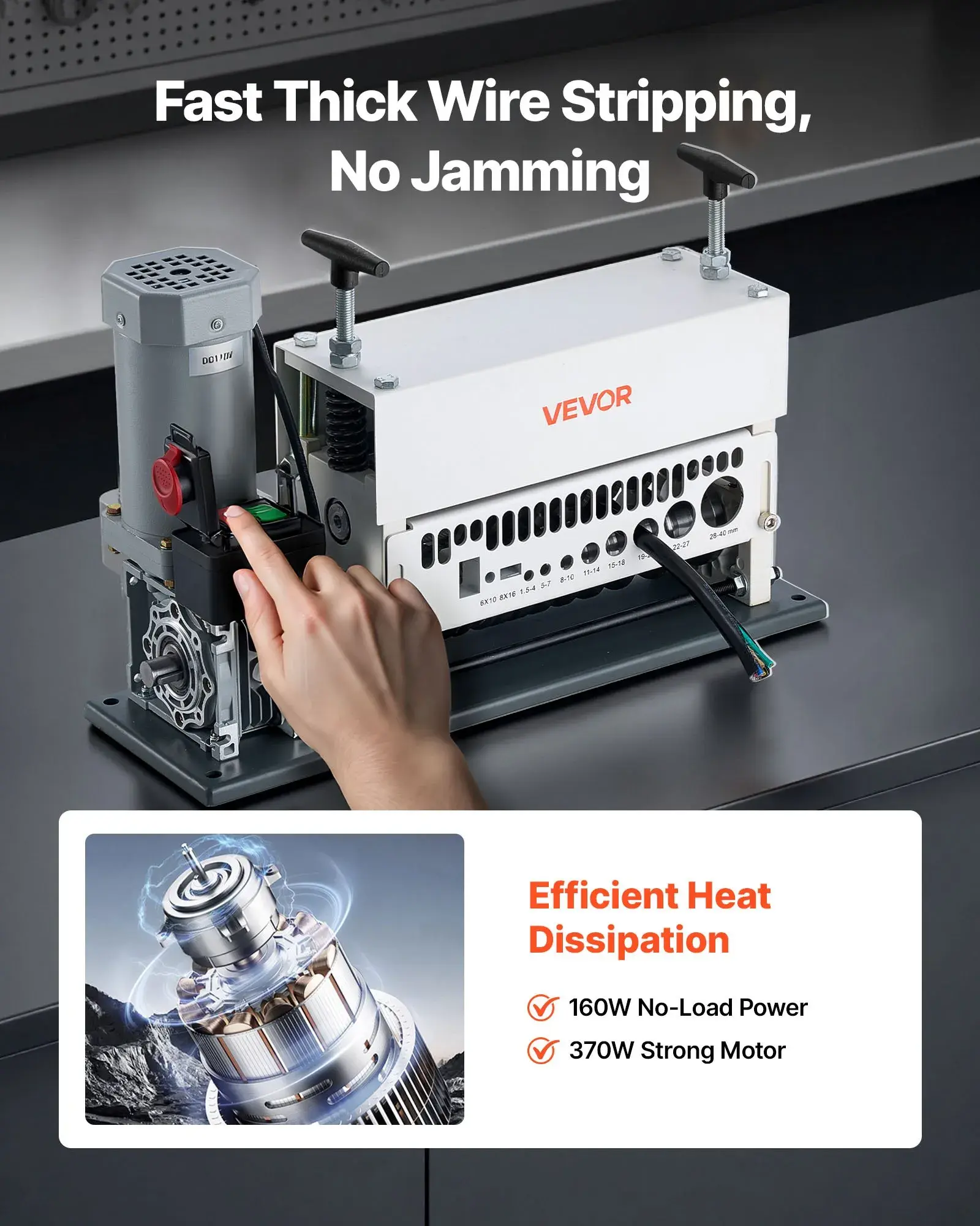 ·High Efficiency Performance: Featuring a 370W copper motor, this automatic wire stripping machine delivers outstanding power and speed, outperforming manual machines. The multi-hole wire inlet allows quick wire size switching without changing parts