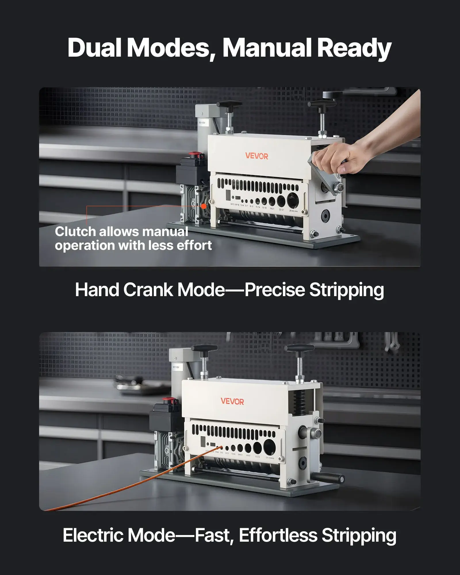 ·Manual or Electric Dual Modes: Enjoy two stripping modes with our wire cable stripper. Use the electricity for efficient stripping of large batches, or switch to manual mode when unplugged — the clutch disengages for smooth hand-crank operation