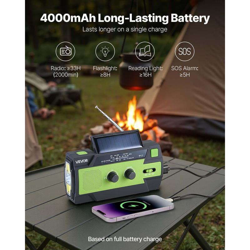 • Long-Lasting Battery: The 4000mAh battery powers lighting, radio, reading, and SOS for up to 33 hours. This solar hand crank emergency radio also serves as a phone charger so you can stay connected during camping trips or blackouts