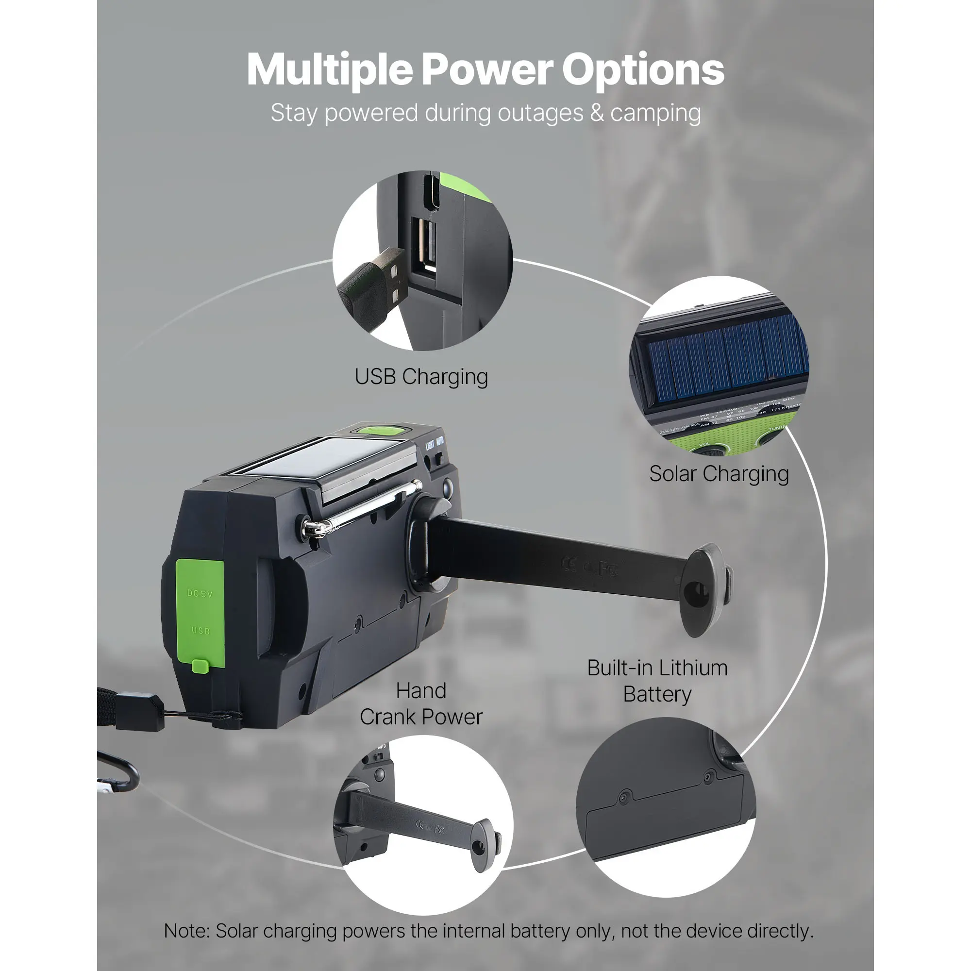 • Multiple Power Sources: Built-in battery, USB charging, solar panel, and hand crank options keep your NOAA emergency weather radio running for camping, outages, and emergencies without fear of losing power