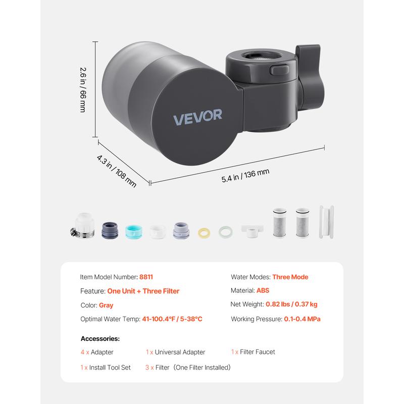 • Efficient Filtration: Featuring advanced carbon fiber technology, the faucet mount water filter reduces harmful impurities such as chlorine, lead, sediment, rust, and fluoride. Working temperature: 41-100.4℉ (5-38℃), working pressure: 0.1-0.4 MPa
