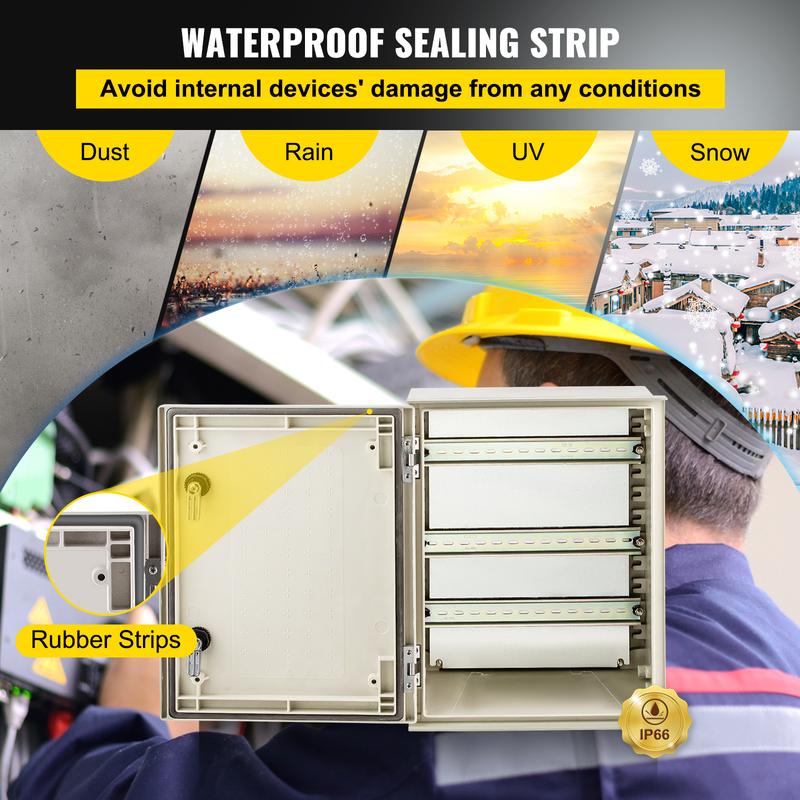 • IP66 Waterproof Grade: The sealing strip has excellent sealing performance, and the fiberglass electrical enclosure body ensures an optimal protection level of IP66, which avoids dirt and water from entering the box when the lid is opened. Keep all your circuits confidently in order.
