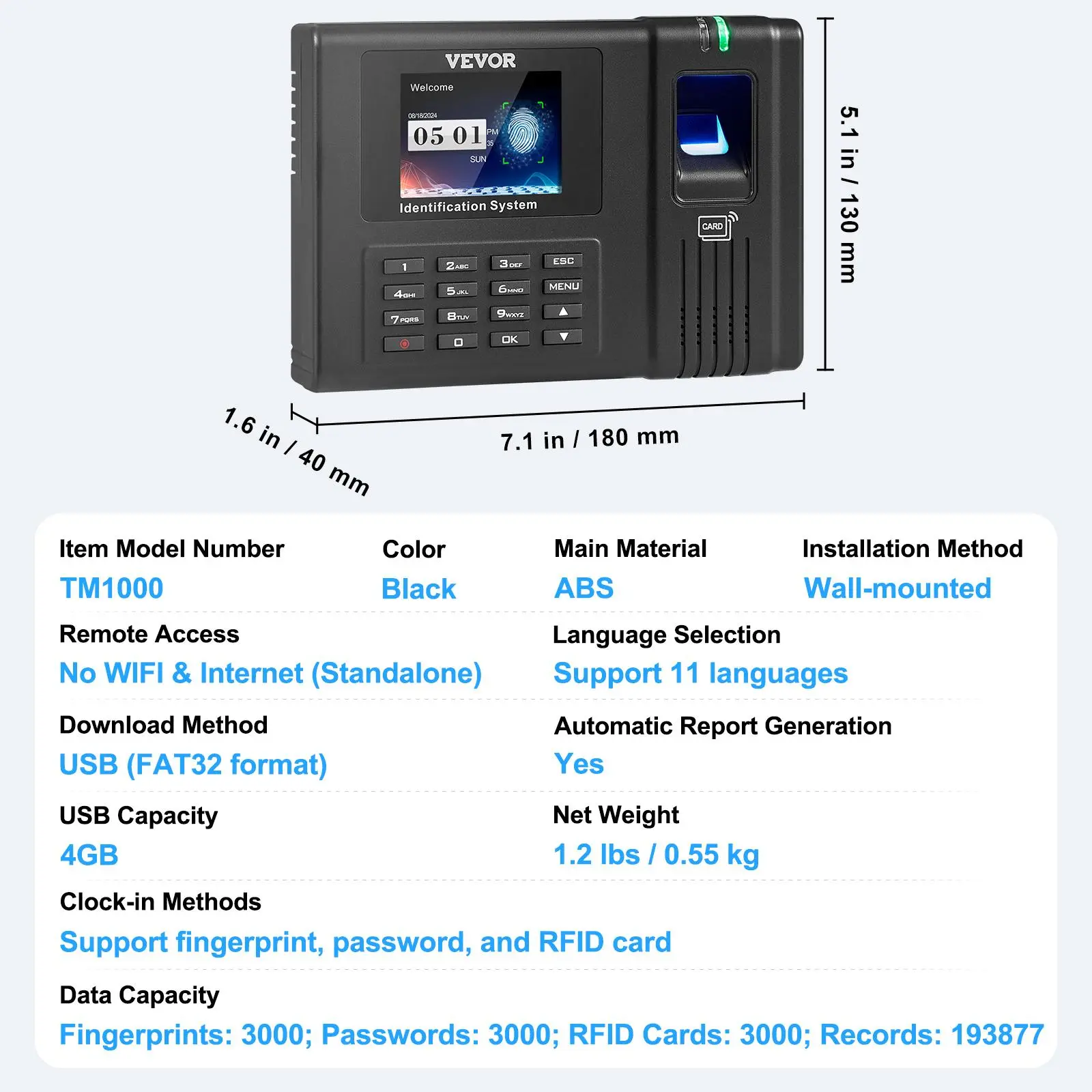 • Three-Mode Verification: VEVOR time clock offers fingerprint, password, and card swipe verification and can store up to 3,000 fingerprints, 3,000 passwords, 3,000 RFID cards, and 193,877 records. It saves you time and money on attendance tracking.