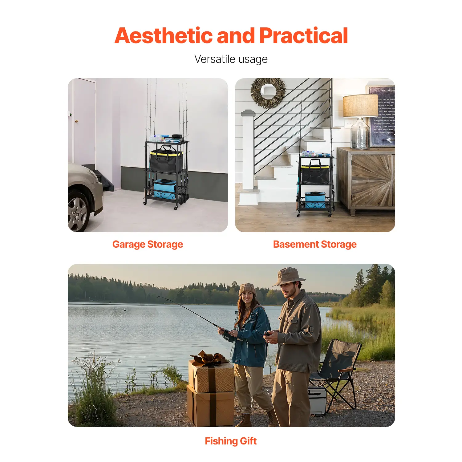 • Multifunctional Storage: The multi-layer fishing rod holder offers ample storage space, allowing you to place large fishing tackle boxes and neatly organize smaller accessories. This helps keep your fishing gear organized