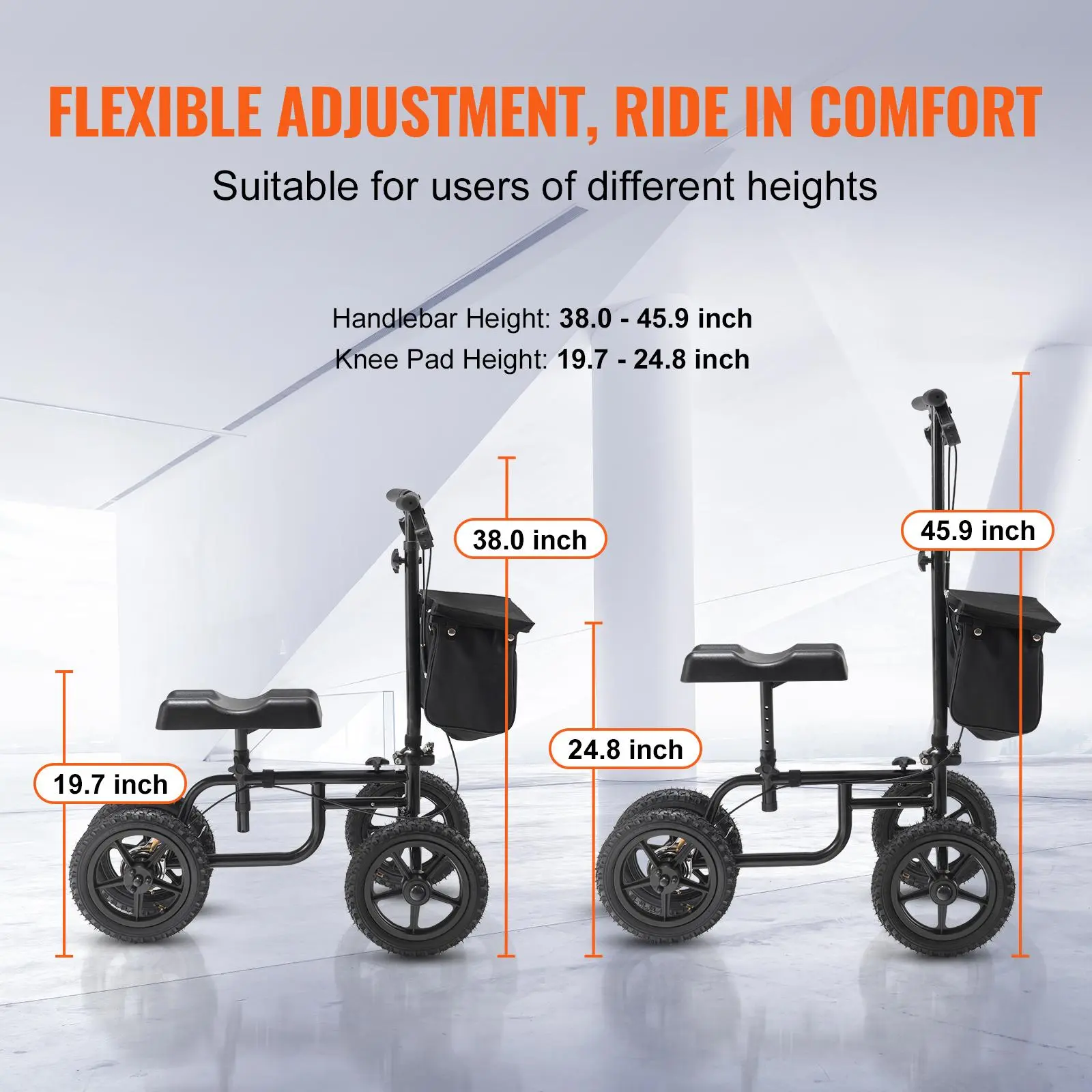 • Personalized Comfort, Tailored to You: With adjustable steering column height ranging from 38.0 to 45.9 inches and knee pad height from 19.7 to 24.8 inches, our steerable knee walker offers personalized customization based on your height, reducing pressure on your injured leg and enhancing your recovery journey.