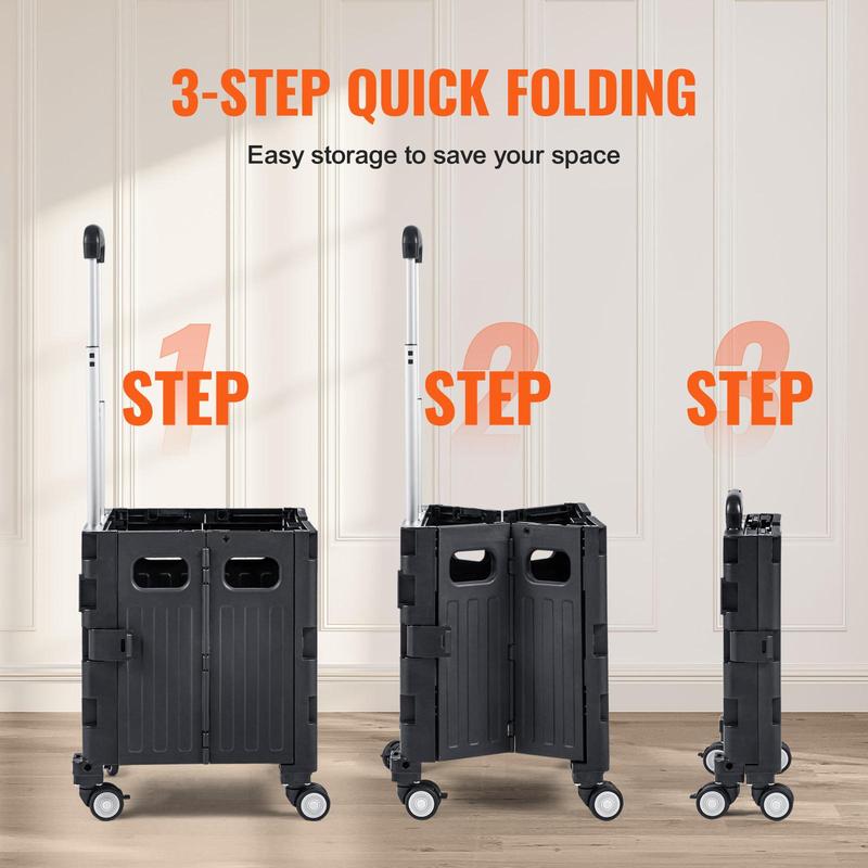 VEVOR Foldable Utility Cart, TikTokShopBlackFriday, 110 lbs Load Capacity, Folding Portable Rolling Crate Handcart with Heavy Duty Telescoping Handle and 4 Rotate Wheels for Travel Shopping Moving Luggage Office Use, Black
